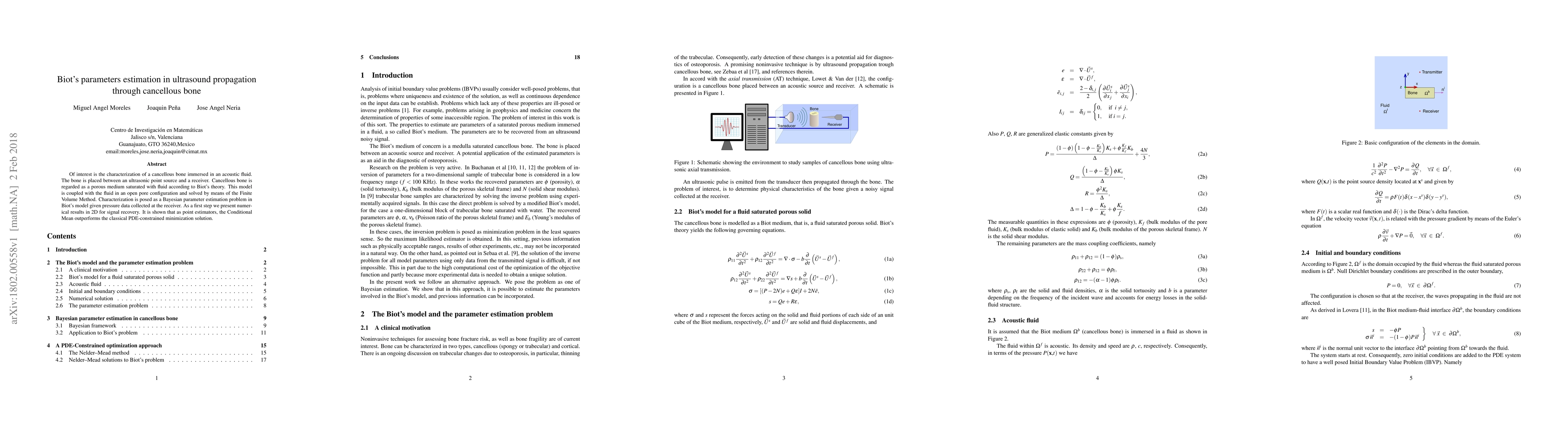 This paper estimates Biot's parameters in ultrasound propagation through cancellous bone using a Bayesian approach. Numerical results in 2D show that the Conditional Mean method outperforms traditional PDE-constrained minimization for signal recovery.
