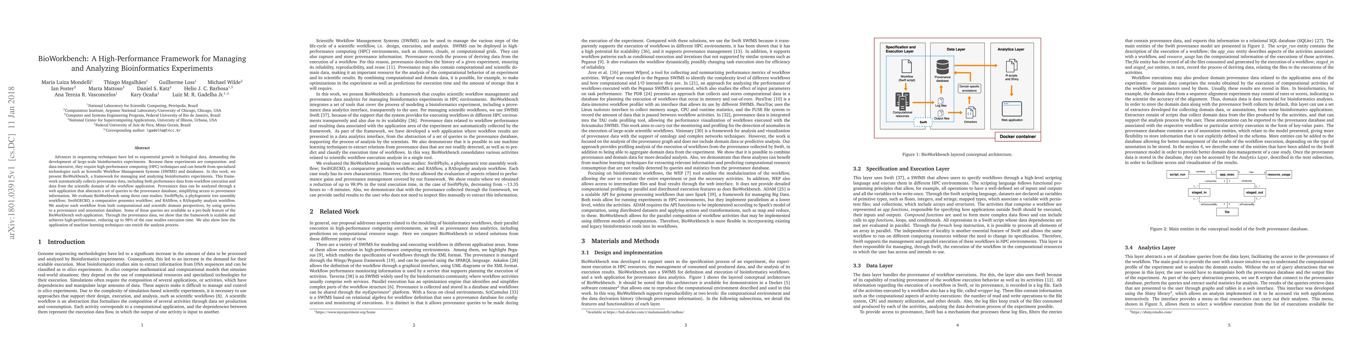 BioWorkbench is a high-performance framework designed to manage and analyze large-scale bioinformatics experiments, leveraging HPC and SWfMS. It collects and analyzes provenance data, demonstrating scalability and high performance, reducing execution time by up to 98% in evaluated case studies.