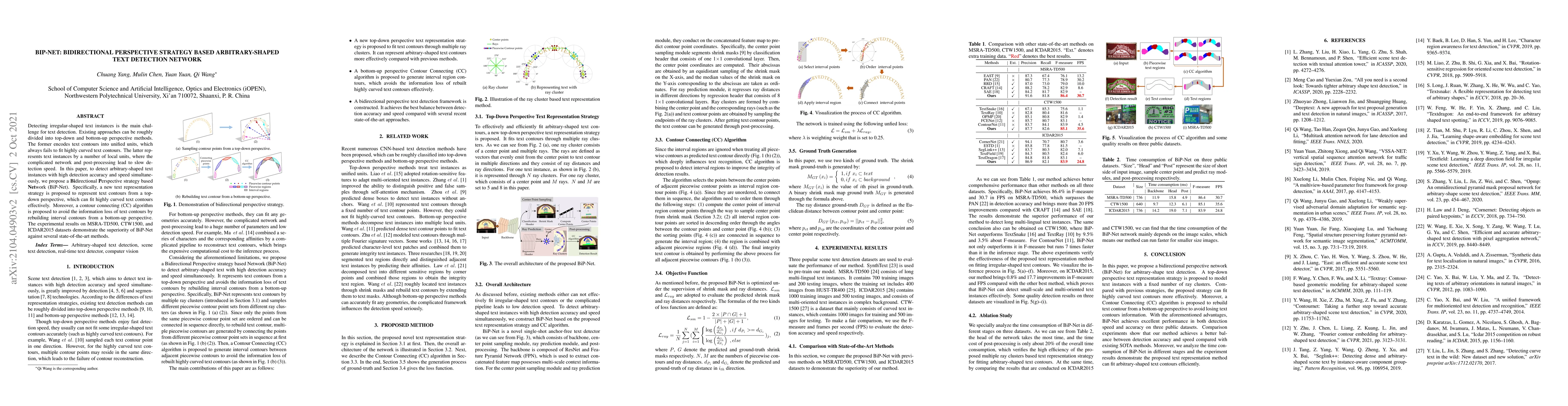 BiP-Net proposes a bidirectional perspective strategy to detect arbitrary-shaped text with high accuracy and speed, combining top-down and bottom-up text representation methods to fit curved contours and avoid information loss. Experimental results show superior performance compared to state-of-the-art methods on multiple datasets.