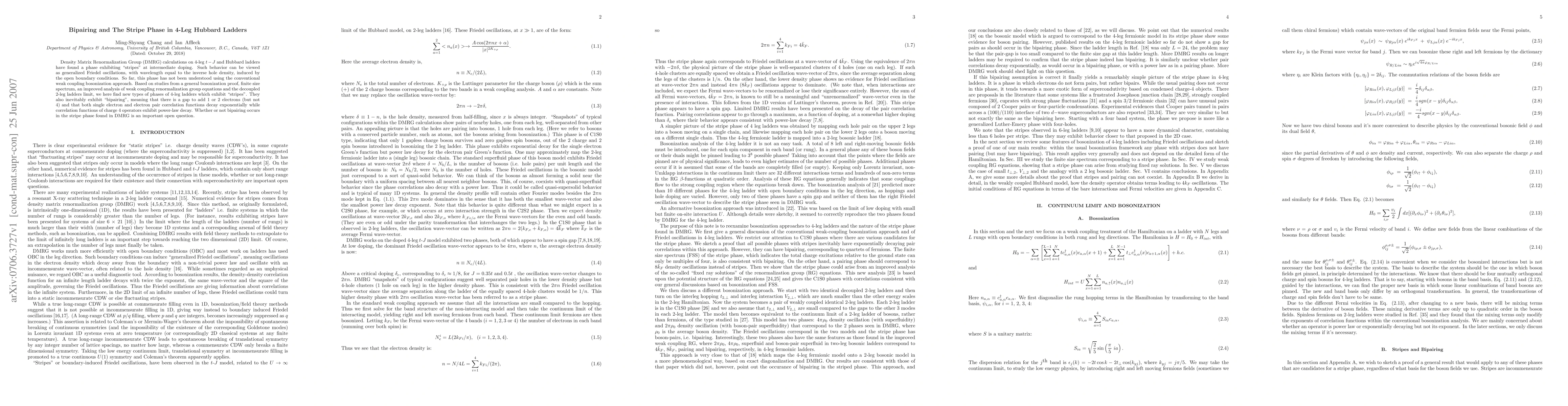This paper uses DMRG calculations to identify a stripe phase in 4-leg t-J and Hubbard ladders, characterized by generalized Friedel oscillations. The study reveals new phases with "bipairing," where adding 1 or 2 electrons creates a gap, while electron and pair correlations decay exponentially, contrasting with power-law decay for charge 4 operators.
