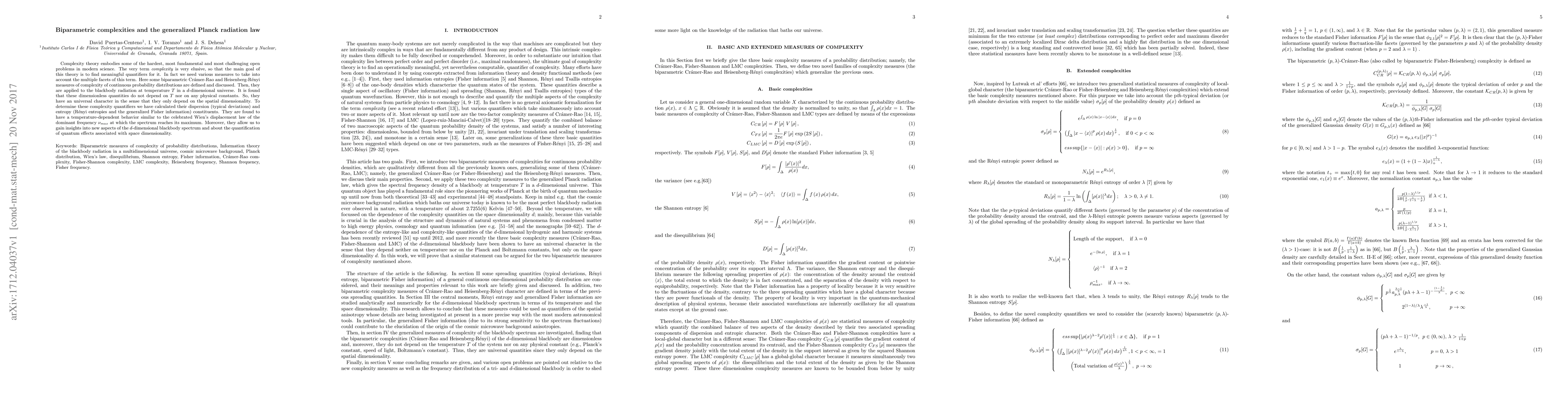 Complexity theory embodies some of the hardest, most fundamental and most challenging open problems in modern science. The very term complexity is very elusive, so that the main goal of this theory is to find meaningful quantifiers for it. In fact we need various measures to take into account the multiple facets of this term. Here some biparametric Cr\'amer-Rao and Heisenberg-R\'enyi measures of complexity of continuous probability distributions are defined and discussed. Then, they are applied to the blackbody radiation at temperature T in a d-dimensional universe. It is found that these dimensionless quantities do not depend on T nor on any physical constants. So, they have an universal character in the sense that they only depend on the spatial dimensionality. To determine these complexity quantifiers we have calculated their dispersion (typical deviations) and entropy (R\'enyi entropies and the generalized Fisher information) constituents. They are found to have a temperature-dependent behavior similar to the celebrated Wien's displacement law of the dominant frequency $\nu_{max}$ at which the spectrum reaches its maximum. Moreover, they allow us to gain insights into new aspects of the d-dimensional blackbody spectrum and about the quantification of quantum effects associated with space dimensionality.