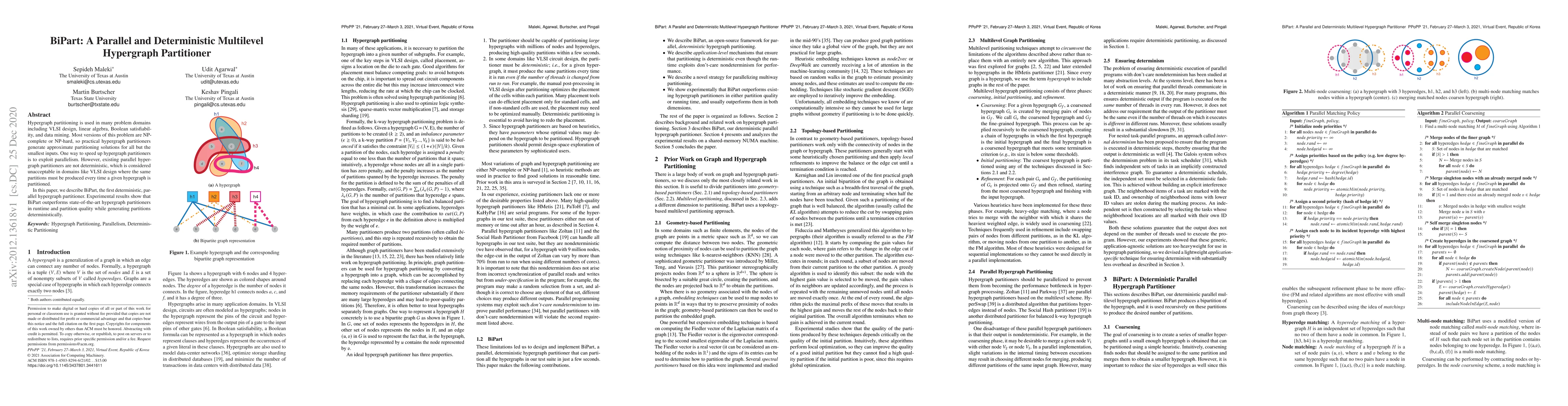 BiPart is the first parallel and deterministic multilevel hypergraph partitioner, designed to address the challenges of NP-complete hypergraph partitioning problems. It outperforms existing methods in both runtime and partition quality while ensuring deterministic results, crucial for applications like VLSI design.