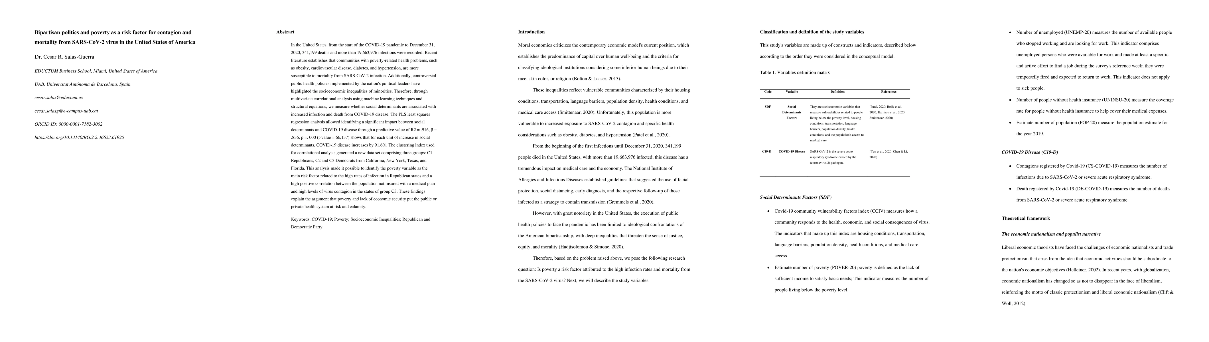In the United States, from the start of the COVID-19 pandemic to December 31, 2020, 341,199 deaths and more than 19,663,976 infections were recorded. Recent literature establishes that communities with poverty-related health problems, such as obesity, cardiovascular disease, diabetes, and hypertension, are more susceptible to mortality from SARS-CoV-2 infection. Additionally, controversial public health policies implemented by the nation's political leaders have highlighted the socioeconomic inequalities of minorities. Therefore, through multivariate correlational analysis using machine learning techniques and structural equations, we measure whether social determinants are associated with increased infection and death from COVID-19 disease. The PLS least squares regression analysis allowed identifying a significant impact between social determinants and COVID-19 disease through a predictive value of R2 = .916, \b{eta} = .836, p =. 000 (t-value = 66,137) shows that for each unit of increase in social determinants, COVID-19 disease increases by 91.6%. The clustering index used for correlational analysis generated a new data set comprising three groups: C1 Republicans, C2 and C3 Democrats from California, New York, Texas, and Florida. This analysis made it possible to identify the poverty variable as the main risk factor related to the high rates of infection in Republican states and a high positive correlation between the population not insured with a medical plan and high levels of virus contagion in the states of group C3. These findings explain the argument that poverty and lack of economic security put the public or private health system at risk and calamity.