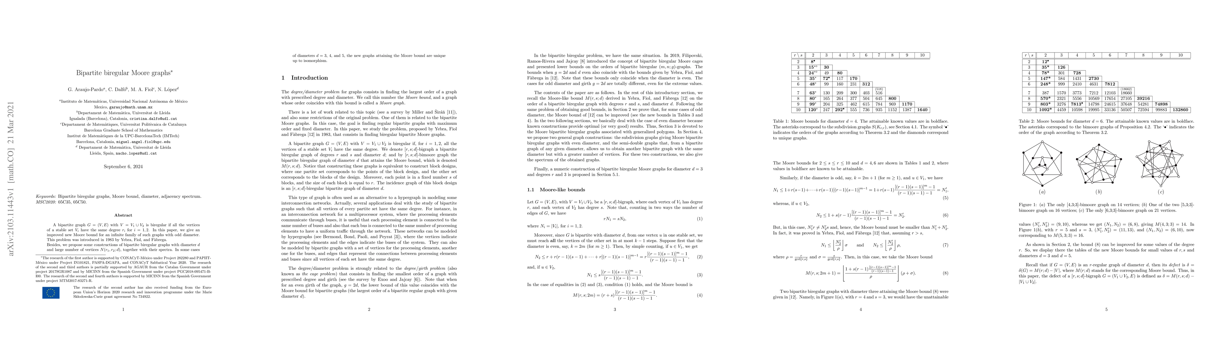 A bipartite graph $G=(V,E)$ with $V=V_1\cup V_2$ is biregular if all the vertices of a stable set $V_i$ have the same degree $r_i$ for $i=1,2$. In this paper, we give an improved new Moore bound for an infinite family of such graphs with odd diameter. This problem was introduced in 1983 by Yebra, Fiol, and F\`abrega.\\ Besides, we propose some constructions of bipartite biregular graphs with diameter $d$ and large number of vertices $N(r_1,r_2;d)$, together with their spectra. In some cases of diameters $d=3$, $4$, and $5$, the new graphs attaining the Moore bound are unique up to isomorphism.