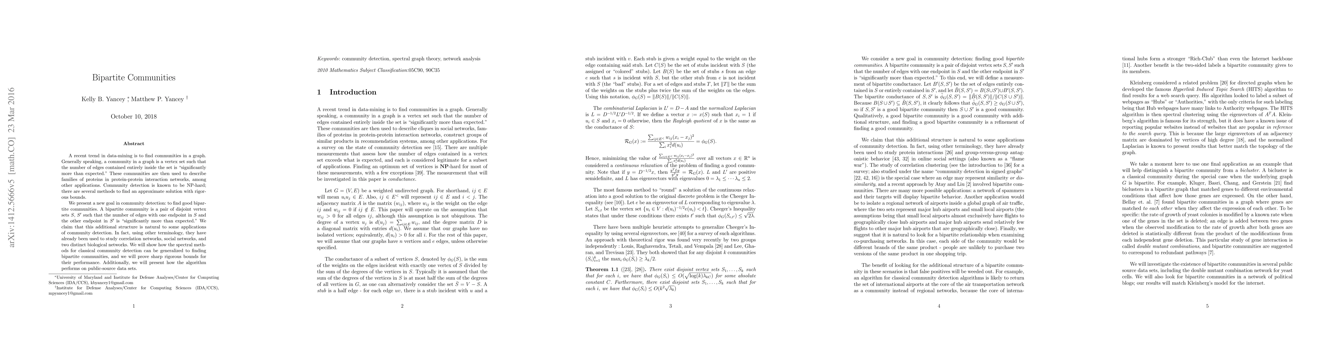 For a given graph, $G$, let $A$ be the adjacency matrix, $D$ is the diagonal matrix of degrees, $L' = D - A$ is the combinatorial Laplacian, and $L = D^{-1/2}L'D^{-1/2}$ is the normalized Laplacian. Recently, the eigenvectors corresponding to the smallest eigenvalues of $L$ and $L'$ have been of great interest because of their application to community detection, which is a nebulously defined problem that essentially seeks to find a vertex set $S$ such that there are few edges incident with exactly one vertex of $S$. The connection between community detection and the second smallest eigenvalue (and the corresponding eigenvector) is well-known. The $k$ smallest eigenvalues have been used heuristically to find multiple communities in the same graph, and a justification with theoretical rigor for the use of $k \geq 3$ eigenpairs has only been found very recently. The largest eigenpair of $L$ has been used more classically to solve the MAX-CUT problem, which seeks to find a vertex set $S$ that maximizes the number of edges incident with exactly one vertex of $S$. Very recently Trevisan presented a connection between the largest eigenvalue of $L$ and a recursive approach to the MAX-CUT problem that seeks to find a "bipartite community" at each stage. This is related to Kleinberg's HITS algorithm that finds the largest eigenvalue of $A^TA$. We will provide a justification with theoretical rigor for looking at the $k$ largest eigenvalues of $L$ to find multiple bipartite communities in the same graph, and then provide a heuristic algorithm to find strong bipartite communities that is based on the intuition developed by the theoretical methods. Finally, we will present the results of applying our algorithm to various data-mining problems.