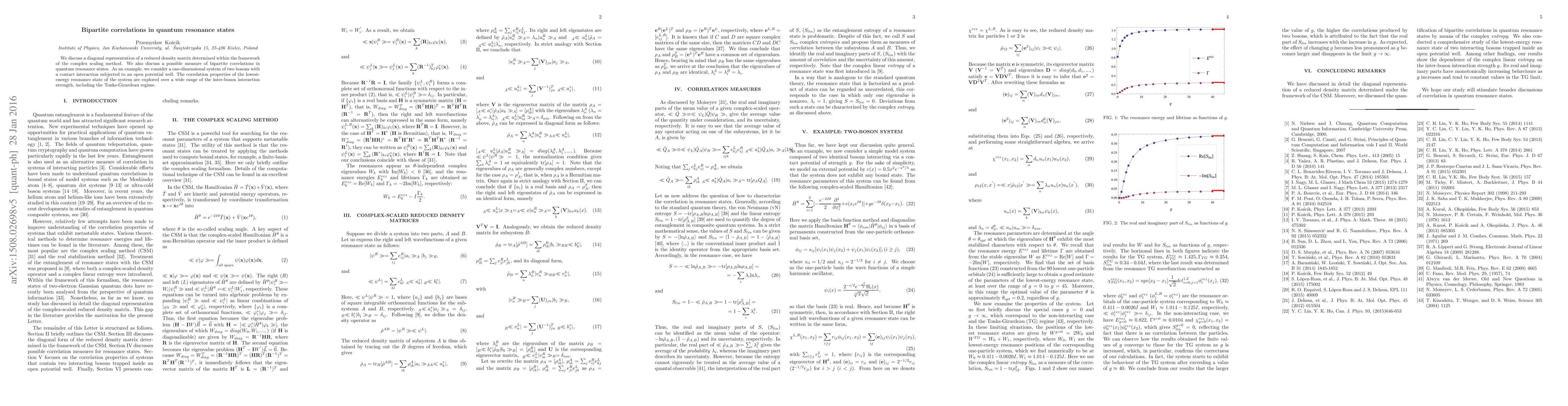 This paper explores bipartite correlations in quantum resonance states using a diagonal representation of a reduced density matrix via the complex scaling method. It examines a one-dimensional system of two bosons with varying interaction strengths, including the Tonks-Girardeau regime, to investigate the correlation properties of the lowest-energy resonance state.