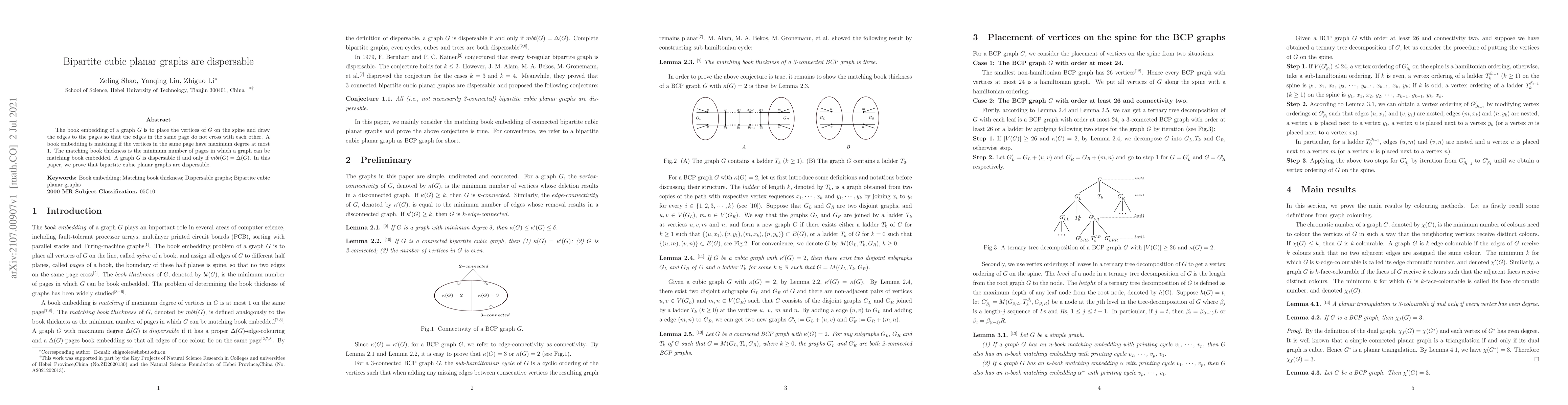 This paper proves that bipartite cubic planar graphs can be embedded in a book such that the matching book thickness equals their maximum degree, establishing their dispersability.