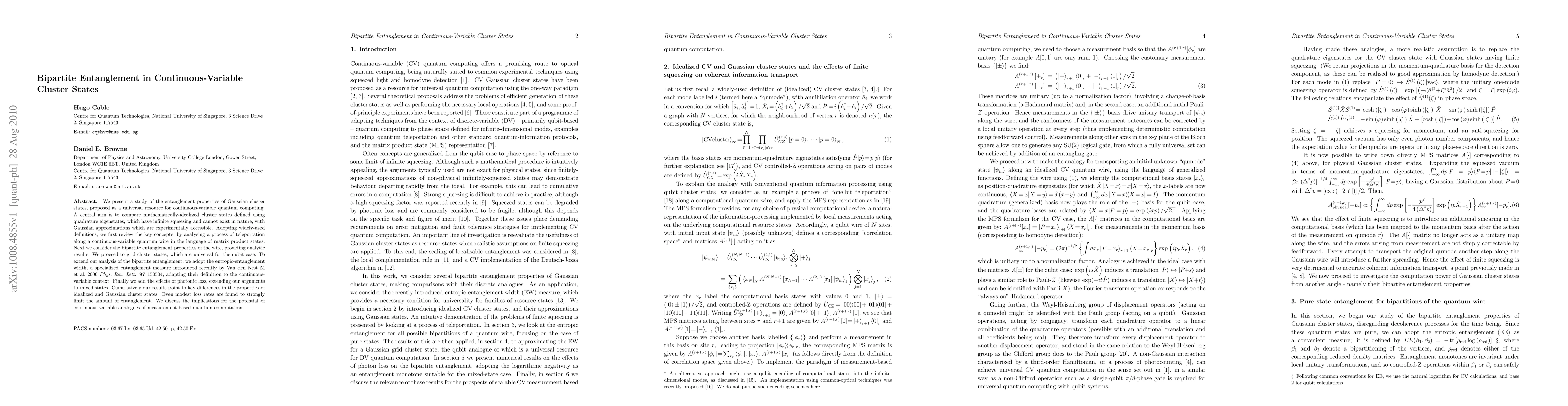This paper investigates the entanglement properties of Gaussian cluster states in continuous-variable quantum computing, comparing them to mathematically-idealized cluster states. It finds that even small photonic losses significantly reduce entanglement, highlighting differences between idealized and experimentally accessible Gaussian states.
