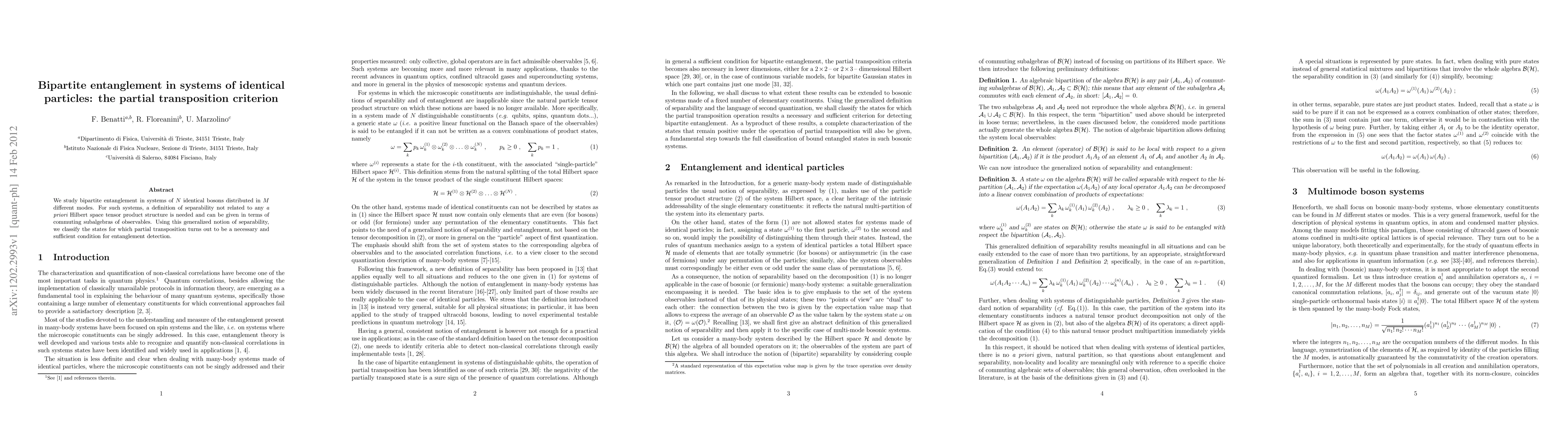 This paper explores bipartite entanglement in systems of identical bosons, proposing a generalized separability definition based on commuting subalgebras. It identifies states where partial transposition serves as a necessary and sufficient criterion for entanglement detection.