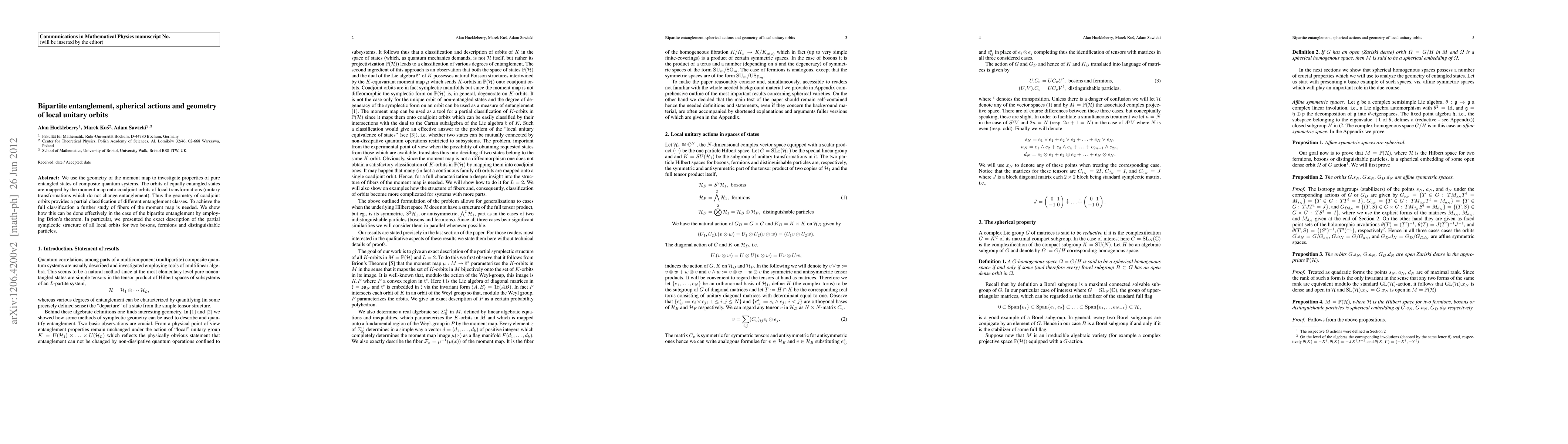 This paper explores the geometry of local unitary orbits in bipartite quantum systems using the moment map, classifying entangled states through coadjoint orbits and employing Brion's theorem for a complete classification of entanglement classes. It provides an exact description of the symplectic structure for two bosons, fermions, and distinguishable particles.