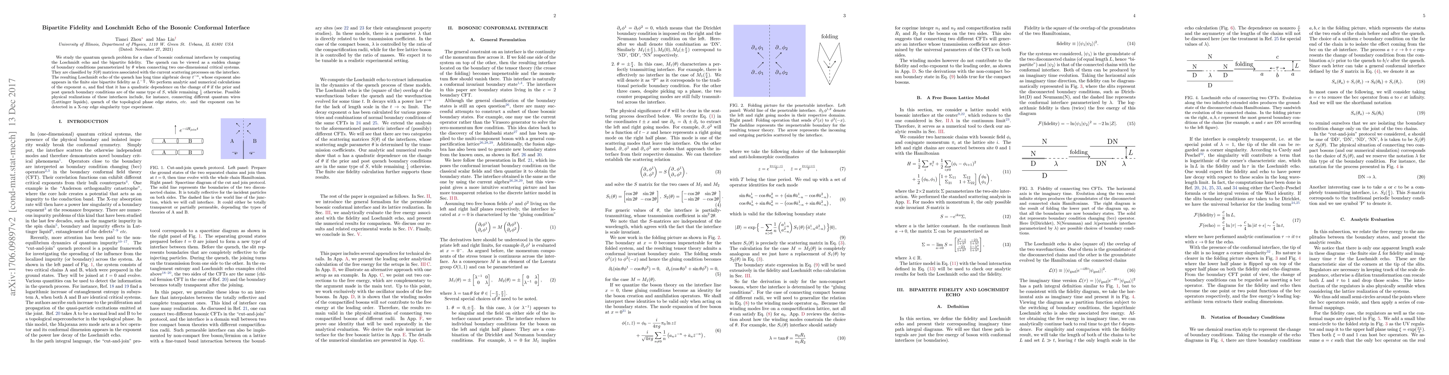 This paper investigates the quantum quench dynamics at bosonic conformal interfaces, analyzing the Loschmidt echo and bipartite fidelity. The study reveals that the Loschmidt echo exhibits long-time algebraic decay with an exponent $\alpha$ that depends on the change in boundary conditions, and this exponent also influences the finite size bipartite fidelity.
