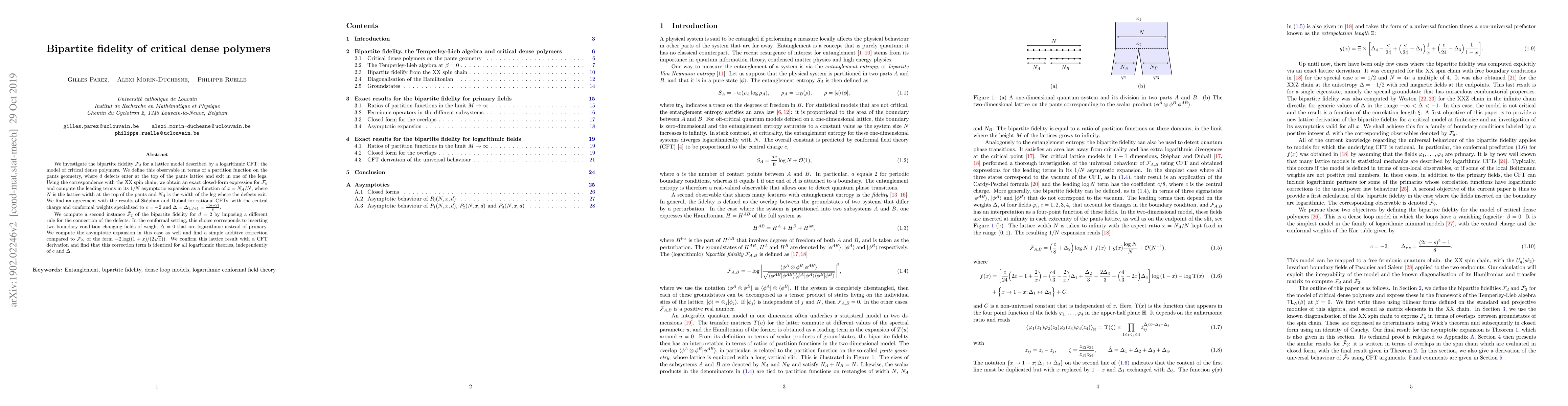 We investigate the bipartite fidelity $\mathcal F_d$ for a lattice model described by a logarithmic CFT: the model of critical dense polymers. We define this observable in terms of a partition function on the pants geometry, where $d$ defects enter at the top of the pants lattice and exit in one of the legs. Using the correspondence with the XX spin chain, we obtain an exact closed-form expression for $\mathcal F_d$ and compute the leading terms in its $1/N$ asymptotic expansion as a function of $x = N_A/N$, where $N$ is the lattice width at the top of the pants and $N_A$ is the width of the leg where the defects exit. We find an agreement with the results of St\'ephan and Dubail for rational CFTs, with the central charge and conformal weights specialised to $c=-2$ and $\Delta = \Delta_{1,d+1} = d(d-2)/8$. We compute a second instance $\mathcal {\tilde F}_2$ of the bipartite fidelity for $d=2$ by imposing a different rule for the connection of the defects. In the conformal setting, this choice corresponds to inserting two boundary condition changing fields of weight $\Delta = 0$ that are logarithmic instead of primary. We compute the asymptotic expansion in this case as well and find a simple additive correction compared to $\mathcal F_2$, of the form $-2\log((1+x)/(2\sqrt{x}))$. We confirm this lattice result with a CFT derivation and find that this correction term is identical for all logarithmic theories, independently of $c$ and $\Delta$.