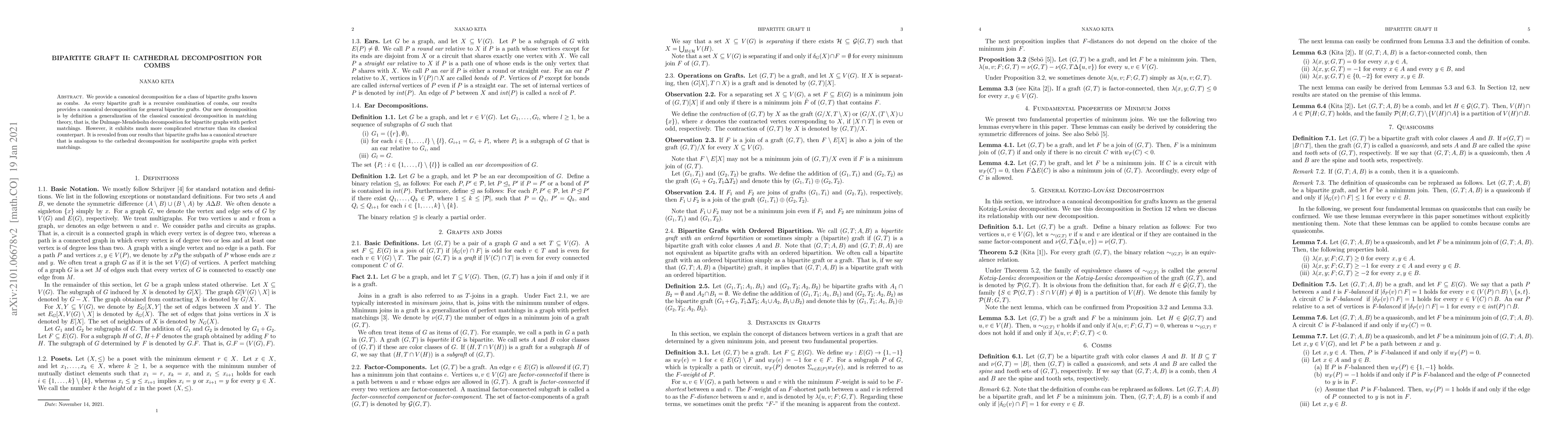 We provide a canonical decomposition for a class of bipartite grafts known as combs. As every bipartite graft is a recursive combination of combs, our results provides a canonical decomposition for general bipartite grafts. Our new decomposition is by definition a generalization of the classical canonical decomposition in matching theory, that is, the Dulmage-Mendelsohn decomposition for bipartite graphs with perfect matchings. However, it exhibits much more complicated structure than its classical counterpart. It is revealed from our results that bipartite grafts has a canonical structure that is analogous to the cathedral decomposition for nonbipartite graphs with perfect matchings.