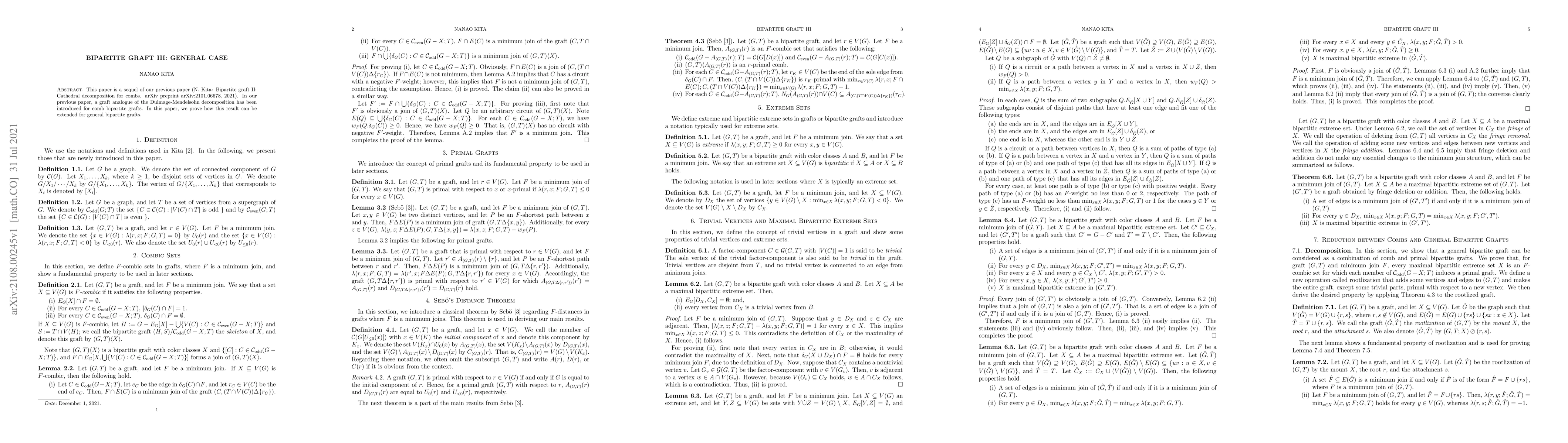 The paper extends the Dulmage-Mendelsohn decomposition for combs to general bipartite grafts, utilizing a graft analogue and proving its extension through lemmas and theorems.