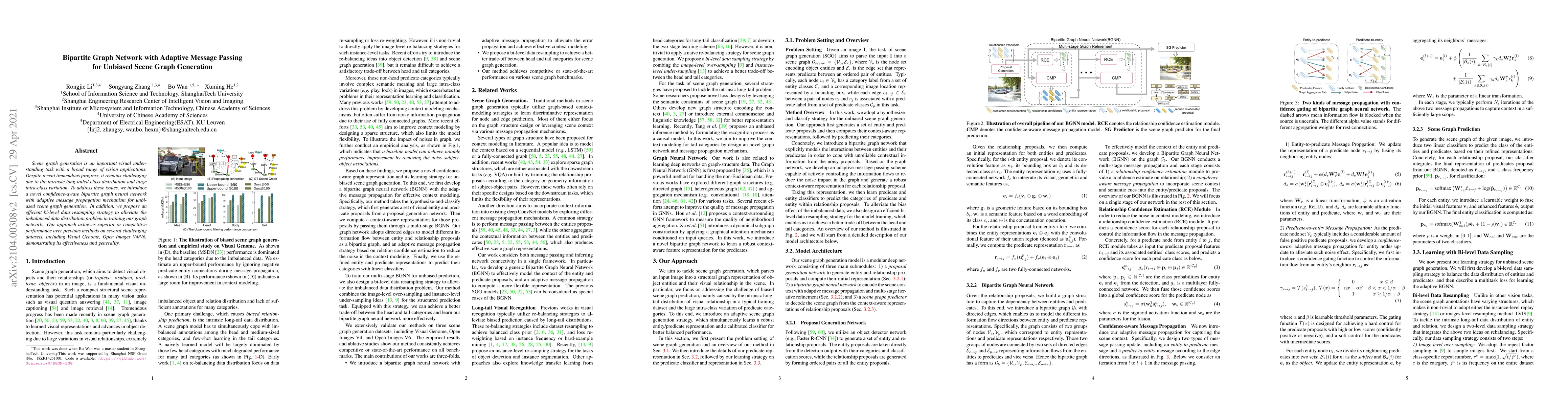 This paper proposes a confidence-aware bipartite graph neural network with adaptive message passing for generating unbiased scene graphs. It also introduces a bi-level data resampling strategy to tackle data imbalance, achieving superior performance on multiple datasets.