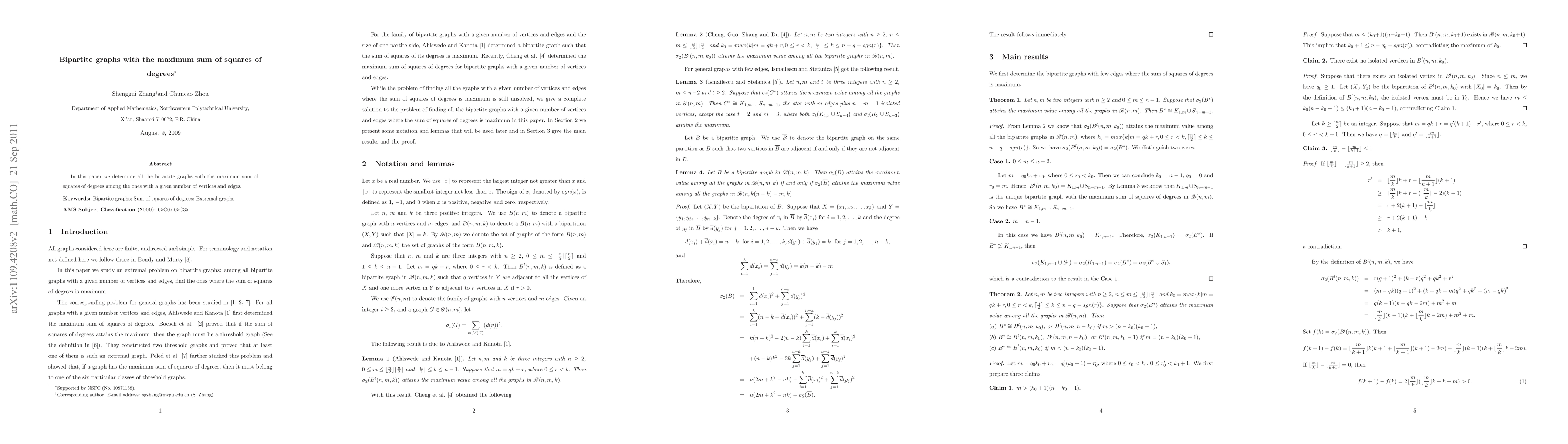 In this paper we determine all the bipartite graphs with the maximum sum of squares of degrees among the ones with a given number of vertices and edges.