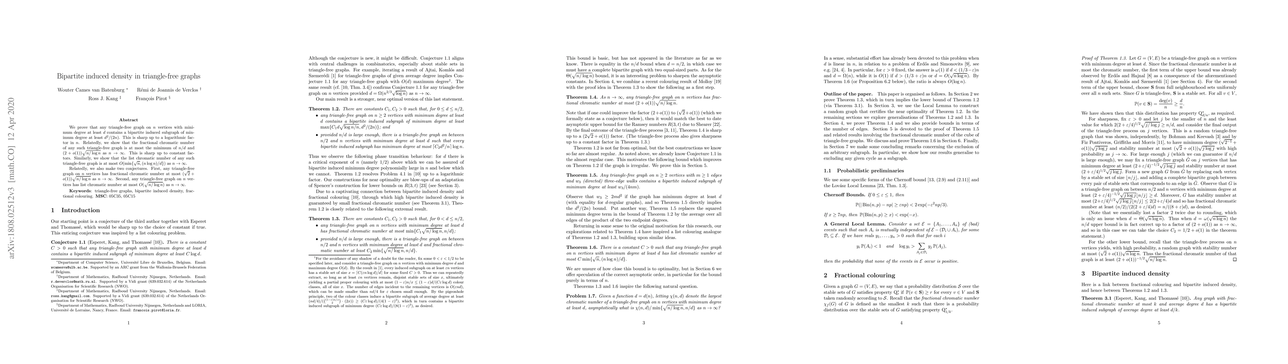 This paper proves that triangle-free graphs with minimum degree $d$ contain a bipartite induced subgraph with minimum degree $d^2/(2n)$, and establishes bounds for the fractional and list chromatic numbers of such graphs, making two conjectures regarding their fractional and list chromatic numbers.