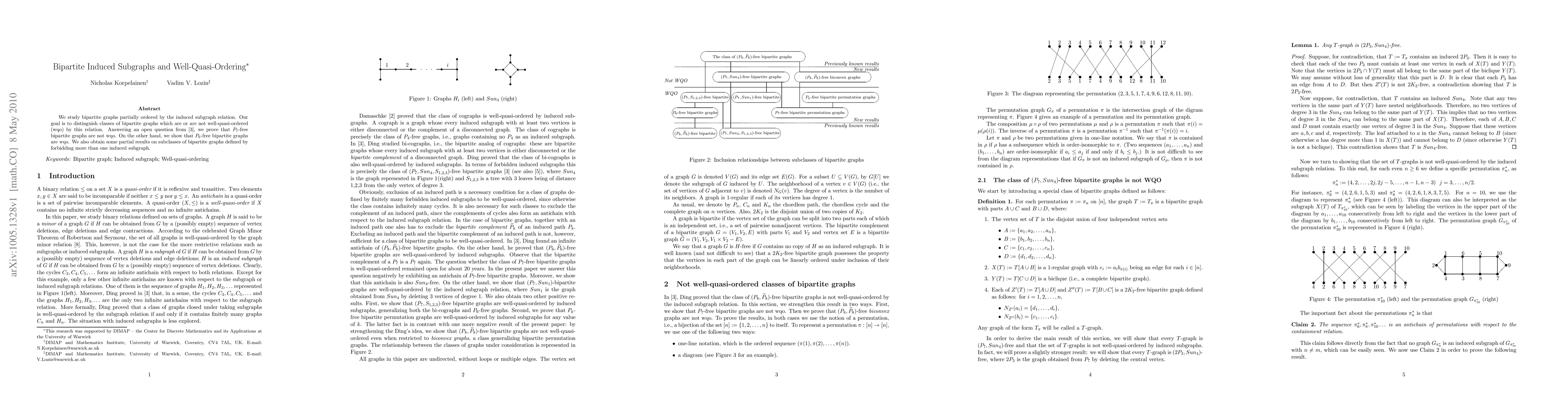 The paper studies bipartite graphs partially ordered by the induced subgraph relation, distinguishing classes that are well-quasi-ordered (wqo) or not by this relation.