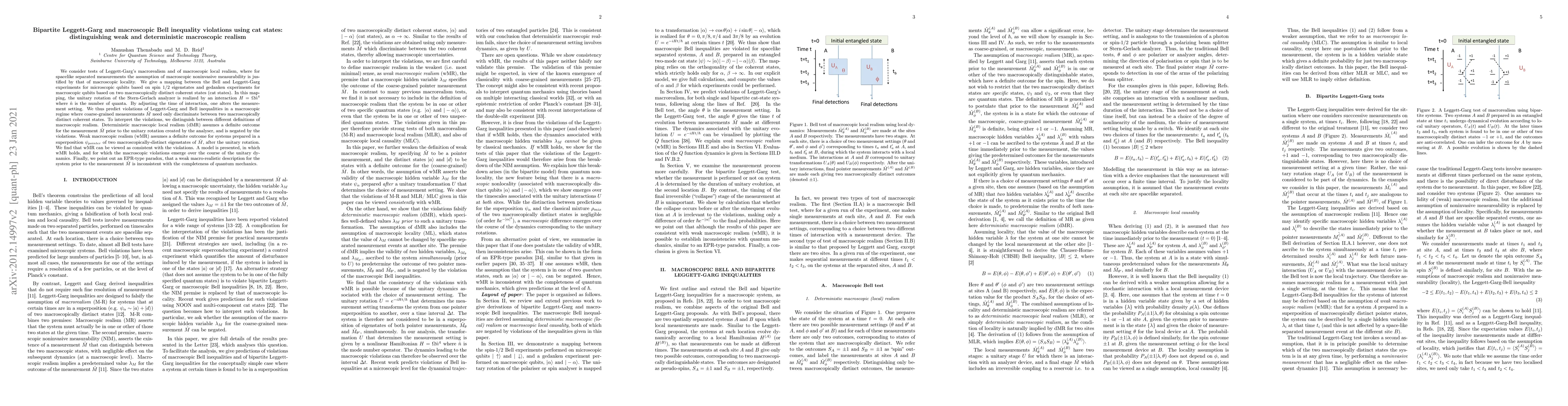 This paper explores the violation of Leggett-Garg and Bell inequalities using cat states to test macroscopic realism, distinguishing between deterministic and weak forms. It proposes a mapping from microscopic to macroscopic qubits, showing that weak macroscopic realism can coexist with the observed violations, while deterministic macroscopic realism is negated by the results.