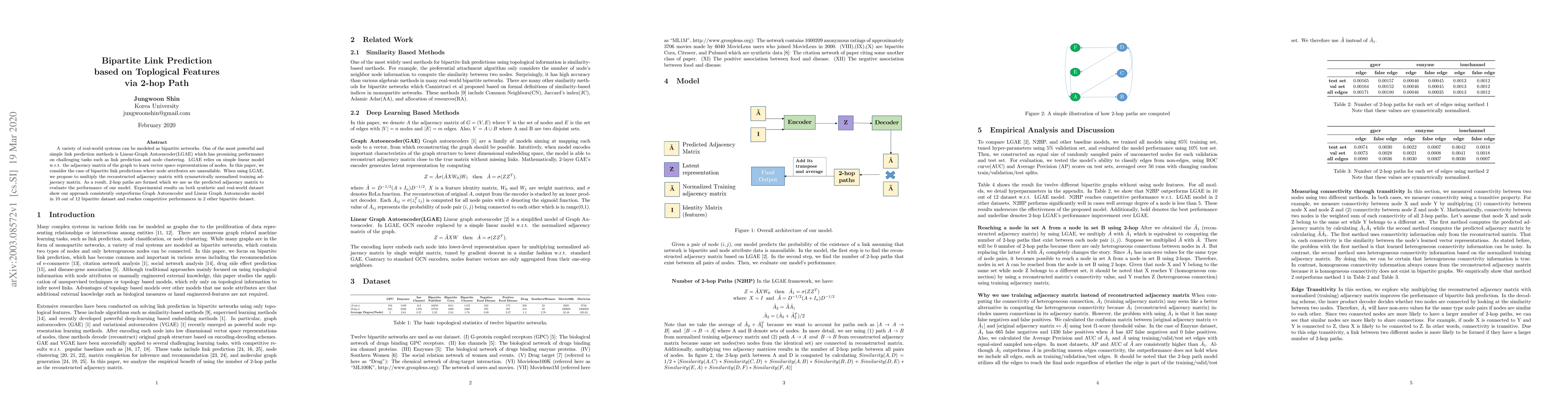 A variety of real-world systems can be modeled as bipartite networks. One of the most powerful and simple link prediction methods is Linear-Graph Autoencoder(LGAE) which has promising performance on challenging tasks such as link prediction and node clustering. LGAE relies on simple linear model w.r.t. the adjacency matrix of the graph to learn vector space representations of nodes. In this paper, we consider the case of bipartite link predictions where node attributes are unavailable. When using LGAE, we propose to multiply the reconstructed adjacency matrix with a symmetrically normalized training adjacency matrix. As a result, 2-hop paths are formed which we use as the predicted adjacency matrix to evaluate the performance of our model. Experimental results on both synthetic and real-world dataset show our approach consistently outperforms Graph Autoencoder and Linear Graph Autoencoder model in 10 out of 12 bipartite dataset and reaches competitive performances in 2 other bipartite dataset.