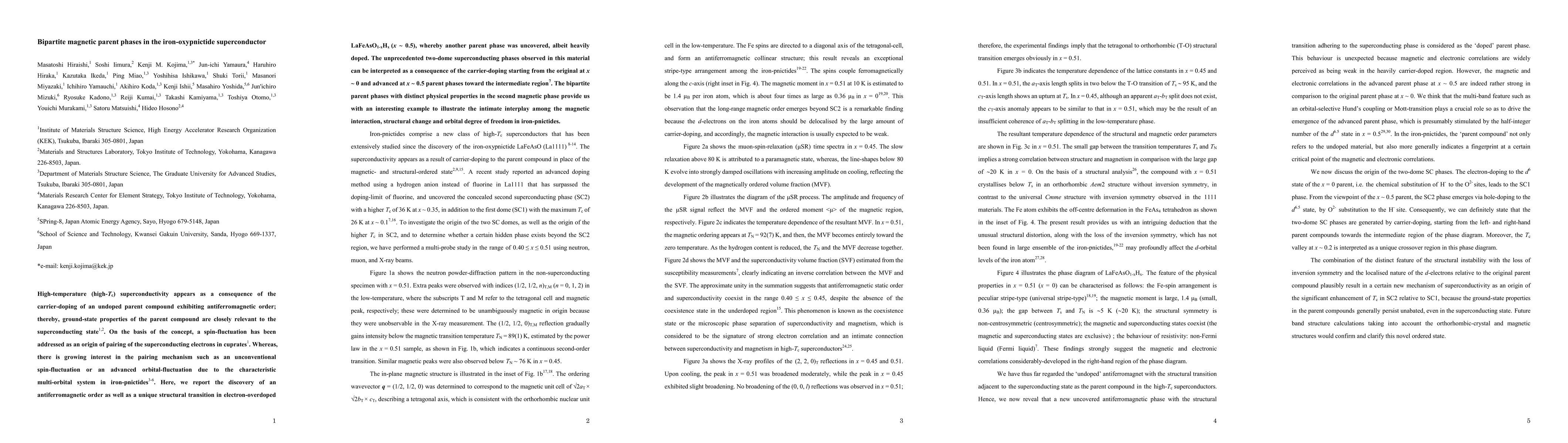 High-temperature (high-$T_{\rm c}$) superconductivity appears as a consequence of the carrier-doping of an undoped parent compound exhibiting antiferromagnetic order; thereby, ground-state properties of the parent compound are closely relevant to the superconducting state. On the basis of the concept, a spin-fluctuation has been addressed as an origin of pairing of the superconducting electrons in cuprates. Whereas, there is growing interest in the pairing mechanism such as an unconventional spin-fluctuation or an advanced orbital-fluctuation due to the characteristic multi-orbital system in iron-pnictides. Here, we report the discovery of an antiferromagnetic order as well as a unique structural transition in electron-overdoped LaFeAsO$_{1-x}$H$_x$ ($x$ ~ 0.5), whereby another parent phase was uncovered, albeit heavily doped. The unprecedented two-dome superconducting phases observed in this material can be interpreted as a consequence of the carrier-doping starting from the original at $x\sim0$ and advanced at $x\sim0.5$ parent phases toward the intermediate region. The bipartite parent phases with distinct physical properties in the second magnetic phase provide us with an interesting example to illustrate the intimate interplay among the magnetic interaction, structural change and orbital degree of freedom in iron-pnictides.