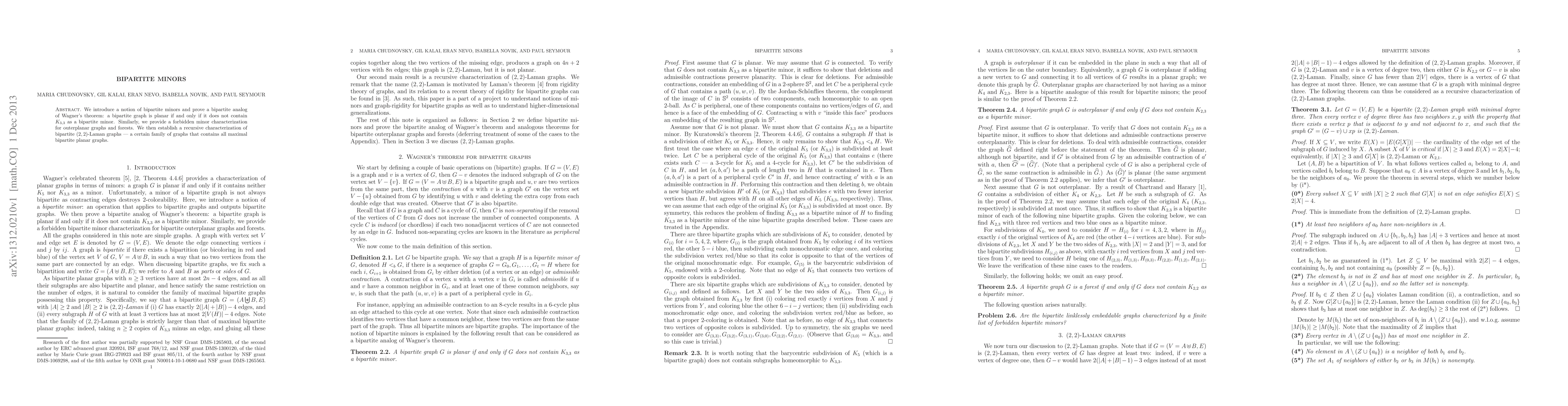 This paper introduces bipartite minors and proves a bipartite analog of Wagner's theorem, establishing that a bipartite graph is planar if and only if it does not contain $K_{3,3}$ as a bipartite minor. It also provides forbidden minor characterizations for outerplanar graphs and forests, and a recursive characterization for bipartite $(2,2)$-Laman graphs.