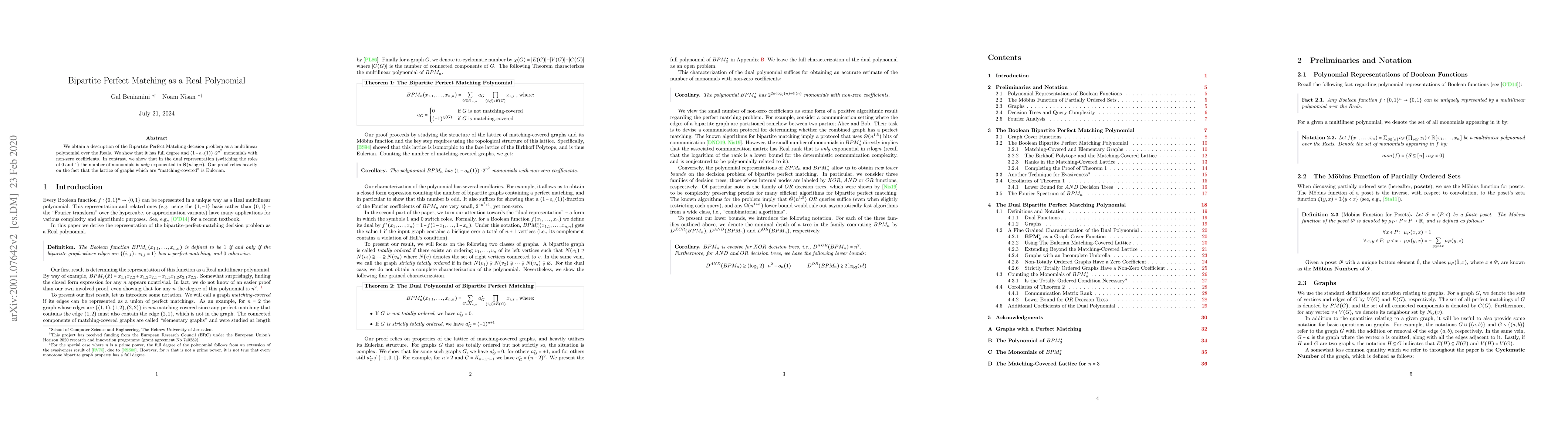 This paper describes the Bipartite Perfect Matching decision problem as a multilinear polynomial over the reals, demonstrating its full degree and a large number of monomials. It contrasts this representation with its dual, showing a significantly smaller number of monomials, leveraging the Eulerian property of the matching-covered lattice of graphs.