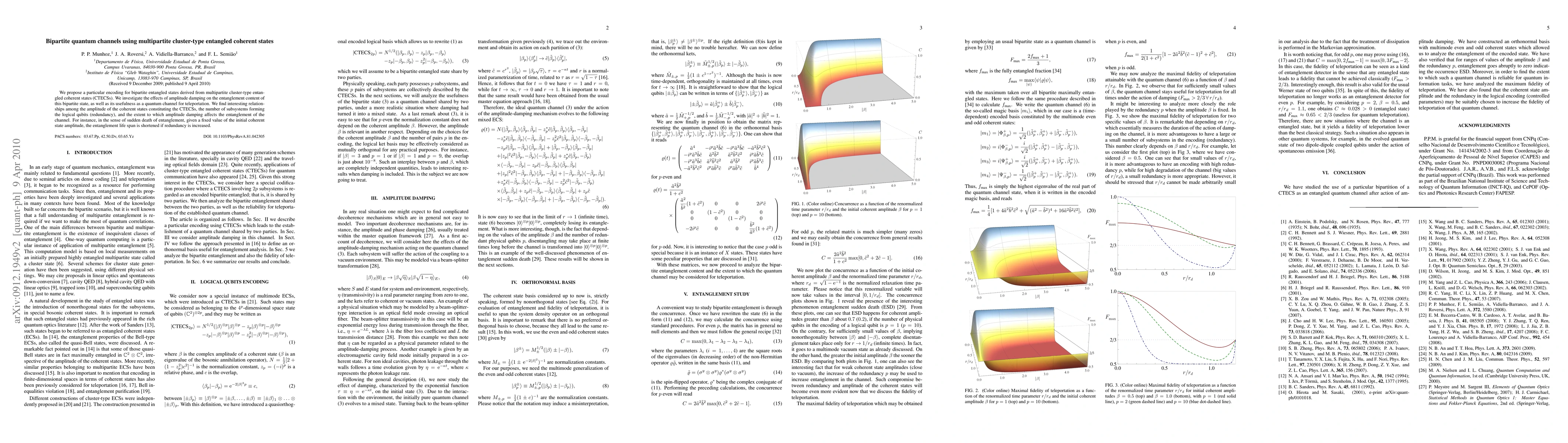 We propose a particular encoding for bipartite entangled states derived from multipartite cluster-type entangled coherent states (CTECSs). We investigate the effects of amplitude damping on the entanglement content of this bipartite state, as well as its usefulness as a quantum channel for teleportation. We find interesting relationships among the amplitude of the coherent states constituting the CTECSs, the number of subsystems forming the logical qubits (redundancy), and the extent to which amplitude damping affects the entanglement of the channel. For instance, in the sense of sudden death of entanglement, given a fixed value of the initial coherent state amplitude, the entanglement life span is shortened if redundancy is increased.