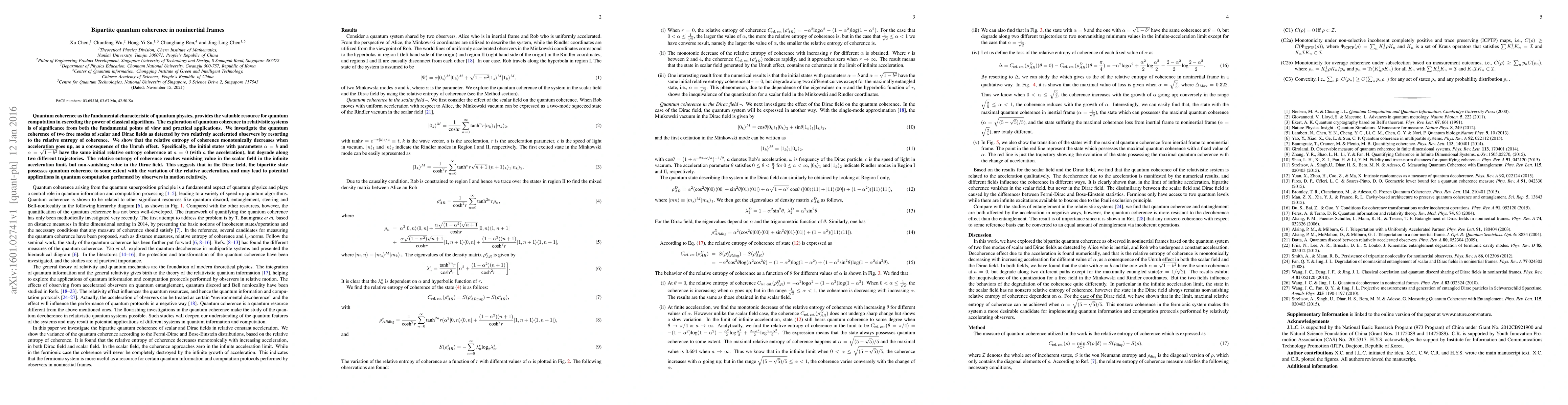 Researchers investigate quantum coherence in relativistic systems, finding that acceleration affects bipartite states differently between scalar and Dirac fields, with potential implications for quantum computation.