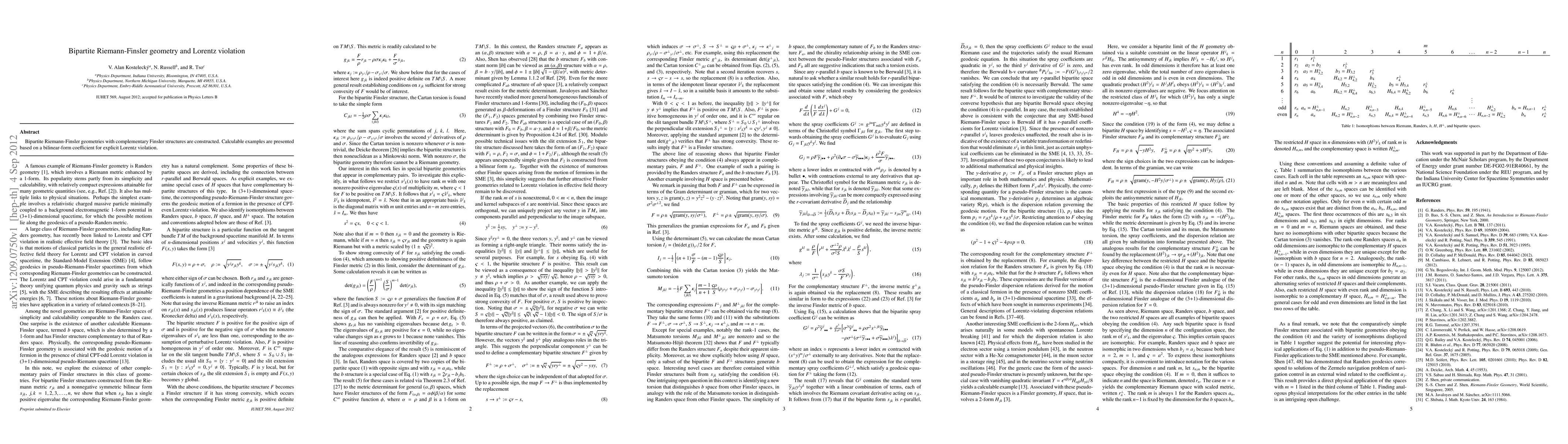 Summary: This paper constructs bipartite Riemann-Finsler geometries featuring complementary Finsler structures and demonstrates calculable examples that illustrate explicit Lorentz violation through a bilinear-form coefficient.