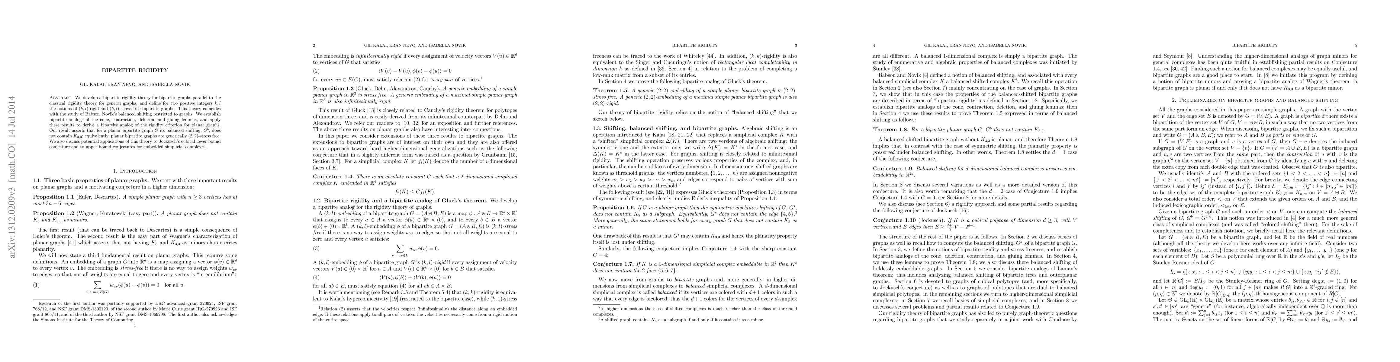 We develop a bipartite rigidity theory for bipartite graphs parallel to the classical rigidity theory for general graphs, and define for two positive integers $k,l$ the notions of $(k,l)$-rigid and $(k,l)$-stress free bipartite graphs. This theory coincides with the study of Babson--Novik's balanced shifting restricted to graphs. We establish bipartite analogs of the cone, contraction, deletion, and gluing lemmas, and apply these results to derive a bipartite analog of the rigidity criterion for planar graphs. Our result asserts that for a planar bipartite graph $G$ its balanced shifting, $G^b$, does not contain $K_{3,3}$; equivalently, planar bipartite graphs are generically $(2,2)$-stress free. We also discuss potential applications of this theory to Jockusch's cubical lower bound conjecture and to upper bound conjectures for embedded simplicial complexes.