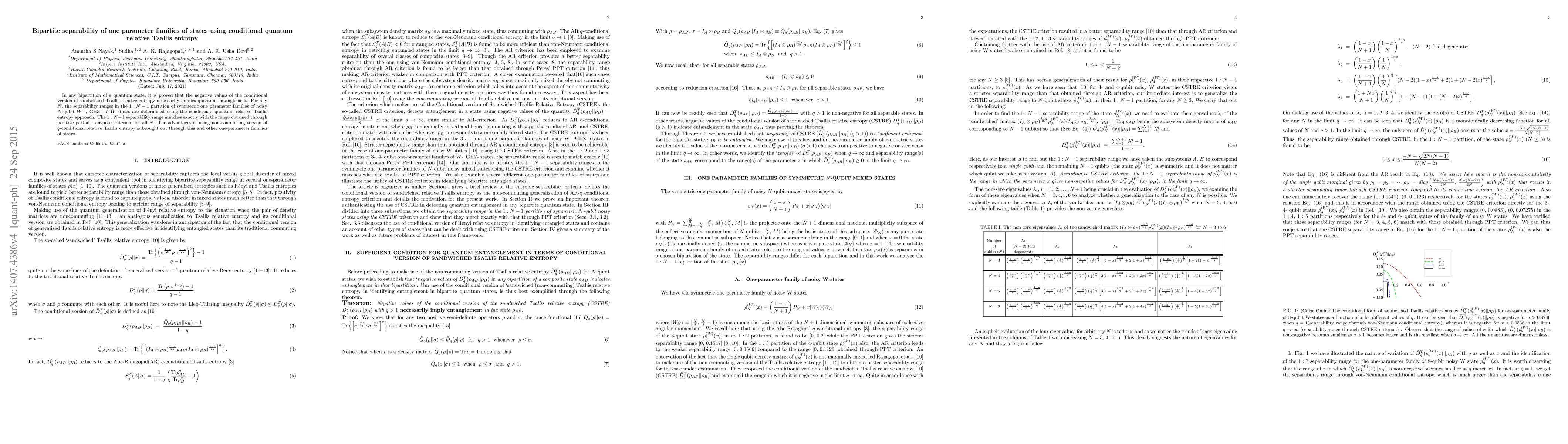 This paper proves that negative values of the conditional Tsallis relative entropy indicate quantum entanglement in any bipartition of a quantum state. It determines the separability ranges for symmetric one-parameter families of noisy N-qubit W and GHZ states using the conditional Tsallis entropy, showing it matches the positive partial transpose criterion.