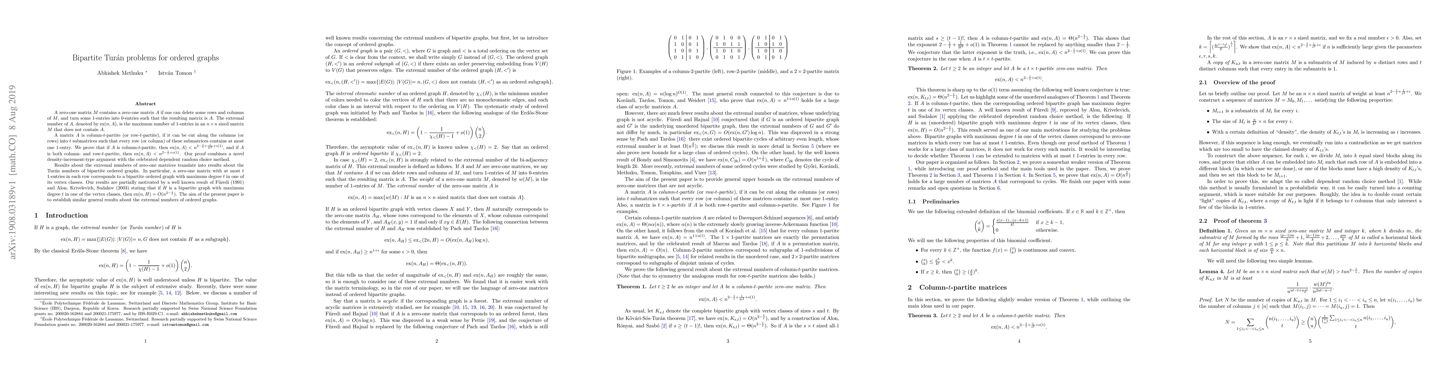 This paper explores extremal numbers for zero-one matrices that avoid certain column-$t$-partite configurations, proving upper bounds on their sizes using a density-increment argument and dependent random choice. The findings translate to the Turán numbers for bipartite ordered graphs, establishing bounds for graphs with restricted maximum degrees in one class.