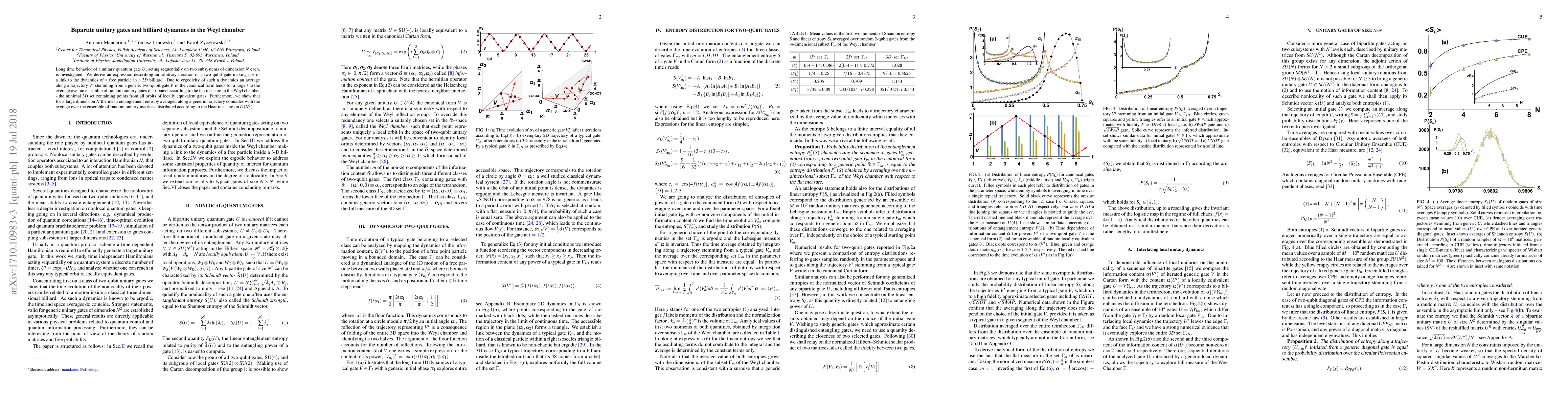 This paper investigates the long-term behavior of unitary quantum gates acting on two subsystems, linking their iterations to the dynamics of a free particle in a 3D billiard. It demonstrates that the ergodic dynamics lead to an average over random unitary gates in the Weyl chamber, and for large dimensions, the mean entanglement entropy along a trajectory matches the average over random unitary matrices.
