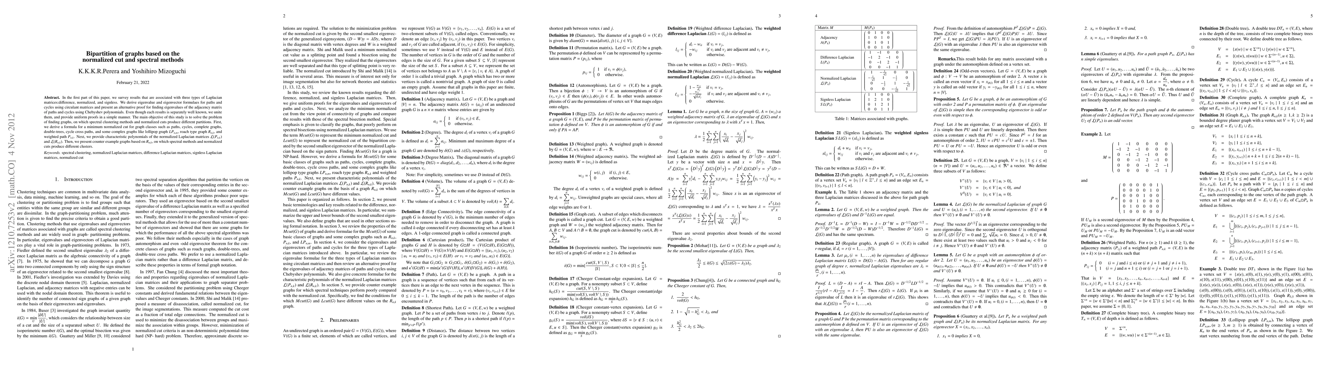 In the first part of this paper, we survey results that are associated with three types of Laplacian matrices:difference, normalized, and signless. We derive eigenvalue and eigenvector formulaes for paths and cycles using circulant matrices and present an alternative proof for finding eigenvalues of the adjacency matrix of paths and cycles using Chebyshev polynomials. Even though each results is separately well known, we unite them, and provide uniform proofs in a simple manner. The main objective of this study is to solve the problem of finding graphs, on which spectral clustering methods and normalized cuts produce different partitions. First, we derive a formula for a minimum normalized cut for graph classes such as paths, cycles, complete graphs, double-trees, cycle cross paths, and some complex graphs like lollipop graph $LP_{n,m}$, roach type graph $R_{n,k}$, and weighted path $P_{n,k}$. Next, we provide characteristic polynomials of the normalized Laplacian matrices ${\mathcal L}(P_{n,k})$ and ${\mathcal L}(R_{n,k})$. Then, we present counter example graphs based on $R_{n,k}$, on which spectral methods and normalized cuts produce different clusters.