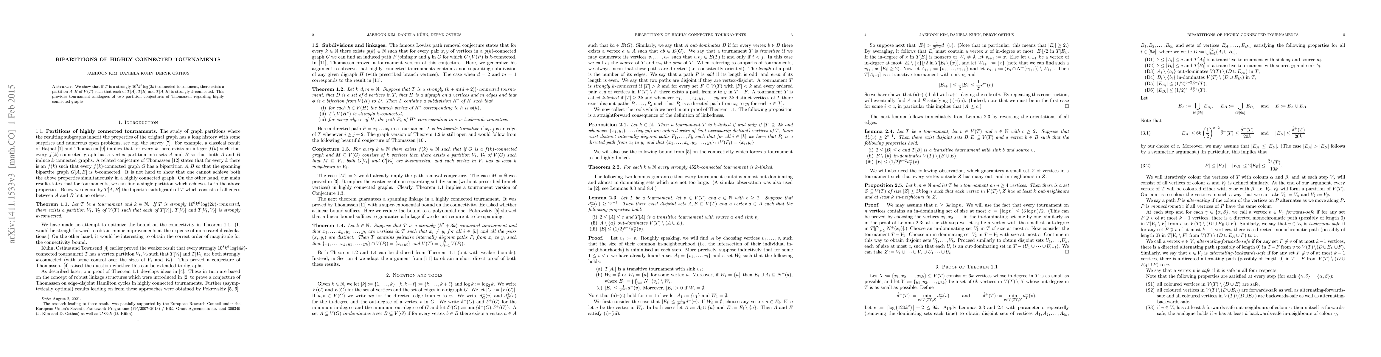 A strongly connected tournament with a high connectivity threshold can be partitioned into two subsets where each subset maintains strong connectivity when removed from the original graph.