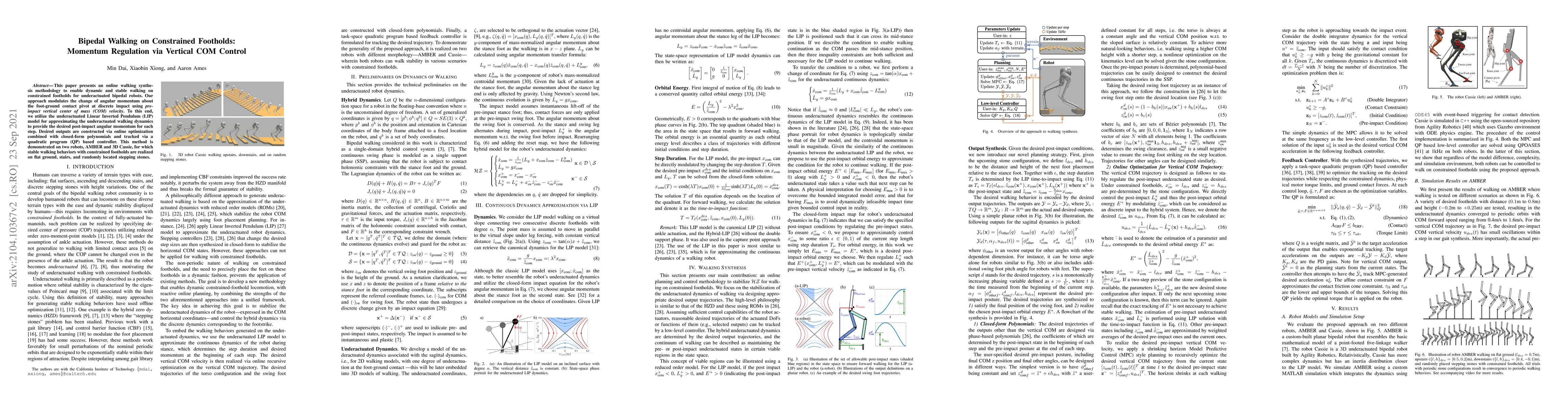 This paper proposes an online walking synthesis method for underactuated bipedal robots to dynamically and stably walk on constrained footholds by regulating momentum through vertical center of mass control. The approach uses the Linear Inverted Pendulum model and online optimization to achieve desired post-impact angular momentum, demonstrated on robots AMBER and 3D Cassie.