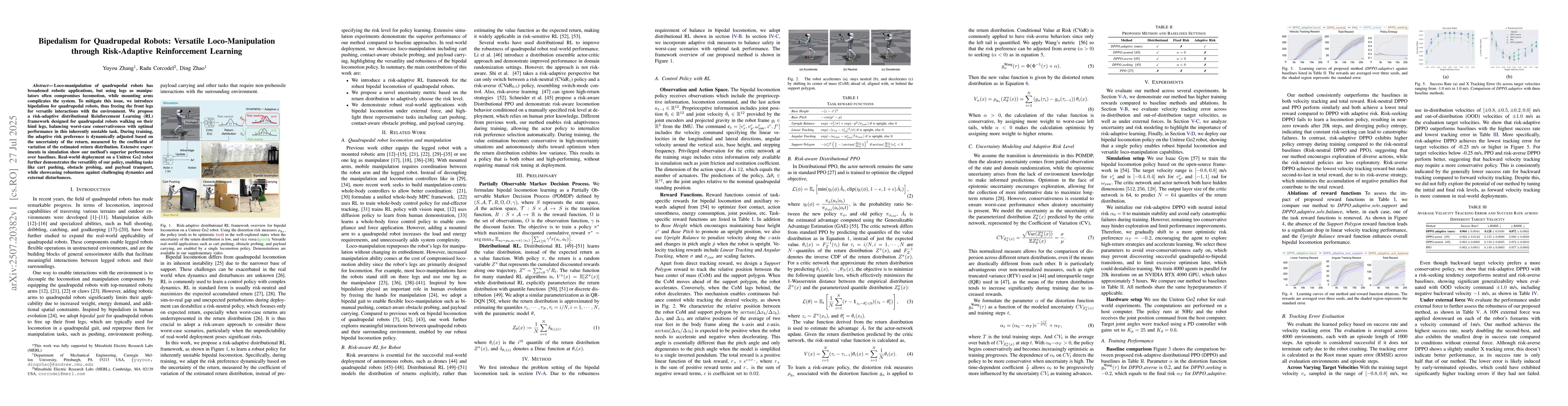 Loco-manipulation of quadrupedal robots has broadened robotic applications, but using legs as manipulators often compromises locomotion, while mounting arms complicates the system. To mitigate this issue, we introduce bipedalism for quadrupedal robots, thus freeing the front legs for versatile interactions with the environment. We propose a risk-adaptive distributional Reinforcement Learning (RL) framework designed for quadrupedal robots walking on their hind legs, balancing worst-case conservativeness with optimal performance in this inherently unstable task. During training, the adaptive risk preference is dynamically adjusted based on the uncertainty of the return, measured by the coefficient of variation of the estimated return distribution. Extensive experiments in simulation show our method's superior performance over baselines. Real-world deployment on a Unitree Go2 robot further demonstrates the versatility of our policy, enabling tasks like cart pushing, obstacle probing, and payload transport, while showcasing robustness against challenging dynamics and external disturbances.