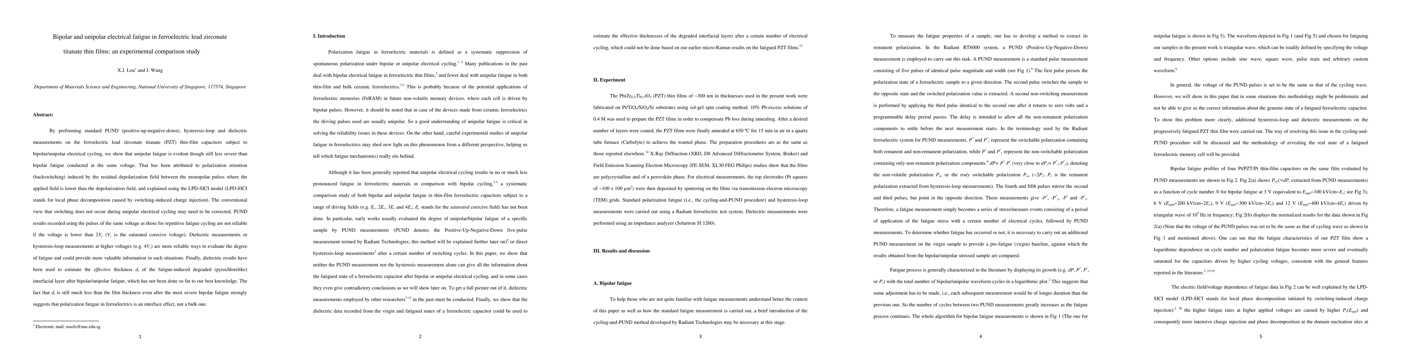 This study compares bipolar and unipolar electrical fatigue in ferroelectric PZT thin films, revealing that unipolar fatigue, though less severe, is still evident due to polarization retention. The LPD-SICI model explains this phenomenon, suggesting that switching may occur during unipolar cycling. Higher voltage measurements are more reliable for assessing fatigue, and the study estimates the thickness of the fatigue-induced interfacial layer, indicating that polarization fatigue is primarily an interface effect.