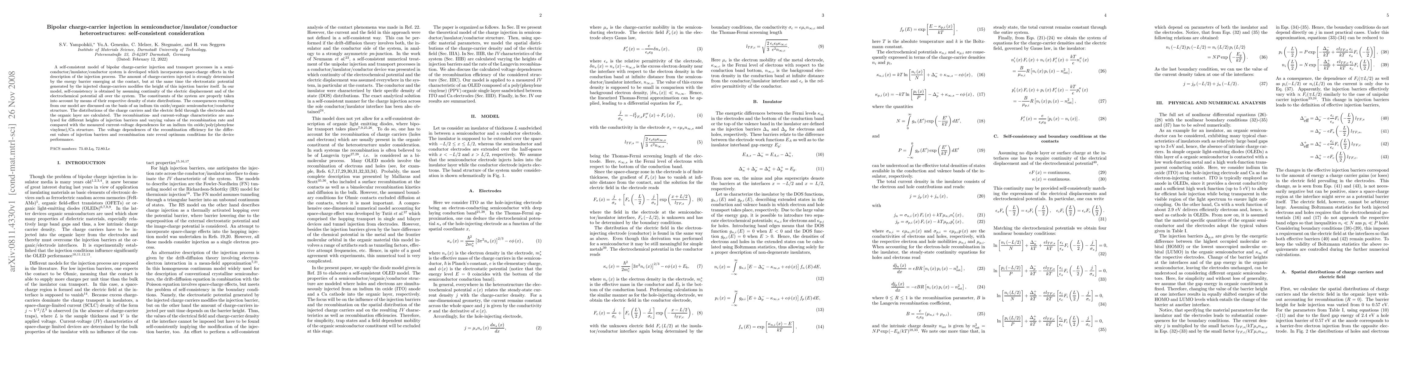 This paper develops a self-consistent model for bipolar charge-carrier injection in semiconductor/insulator/conductor heterostructures, emphasizing the interplay between energy barriers and the electrostatic potential. The model predicts optimal conditions for device performance based on calculated charge carrier and electric field distributions.