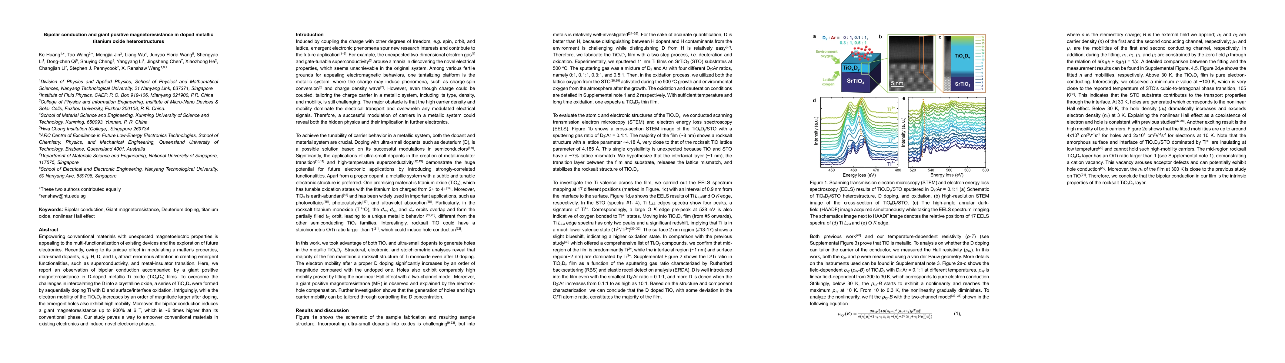 This paper reports the discovery of bipolar conduction and a giant positive magnetoresistance in deuterium-doped metallic titanium oxide films, achieved through a novel doping and oxidation process. The findings suggest significant enhancements in electron and hole mobility, and a magnetoresistance up to 900% at 6 T, indicating potential for advanced electronic applications.