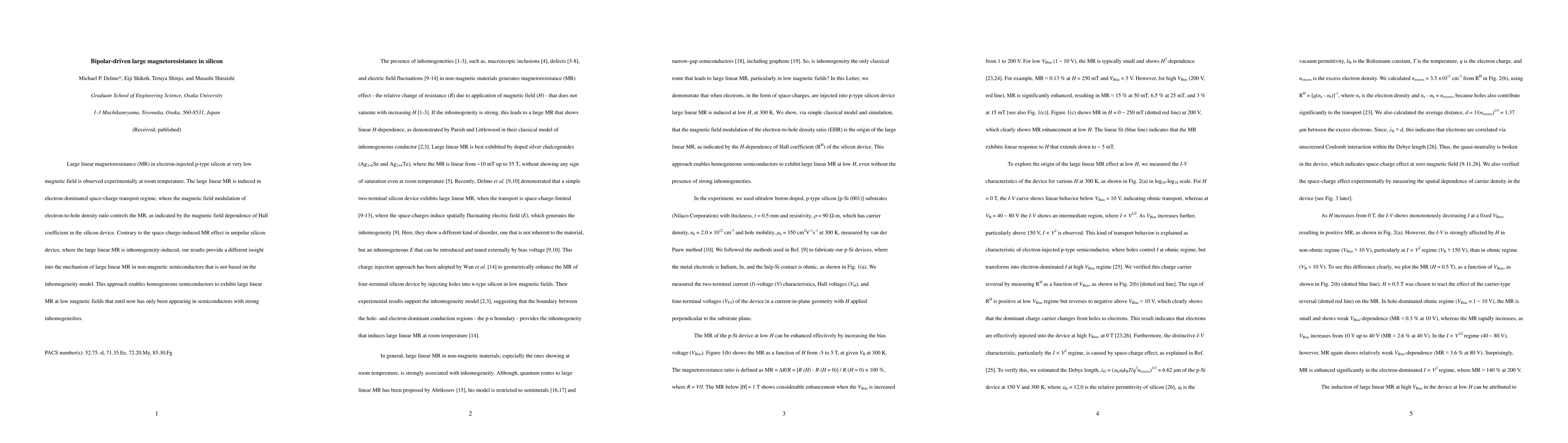 This paper reports the observation of large linear magnetoresistance in electron-injected p-type silicon at room temperature, driven by a bipolar mechanism rather than inhomogeneity. The study reveals a new mechanism for large linear MR in non-magnetic semiconductors, enabling them to exhibit significant magnetoresistance at low magnetic fields.