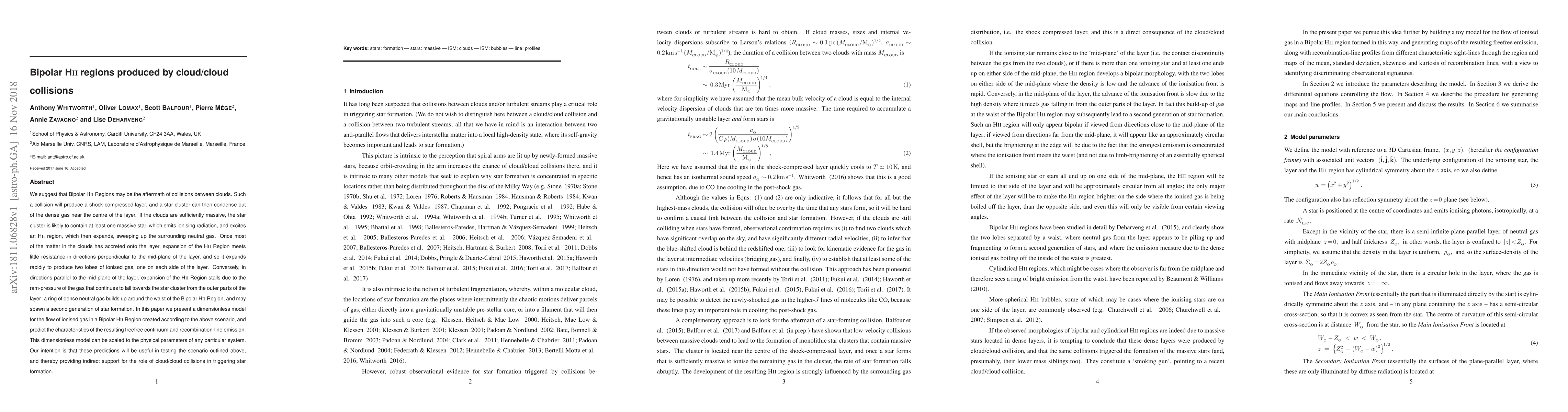 This paper proposes that Bipolar H{\sc ii} Regions form from cloud/cloud collisions, leading to shock-compressed layers where star clusters condense. The model predicts the expansion dynamics and emission characteristics of the resulting H{\sc ii} regions, aiming to test the collision-triggered star formation scenario.