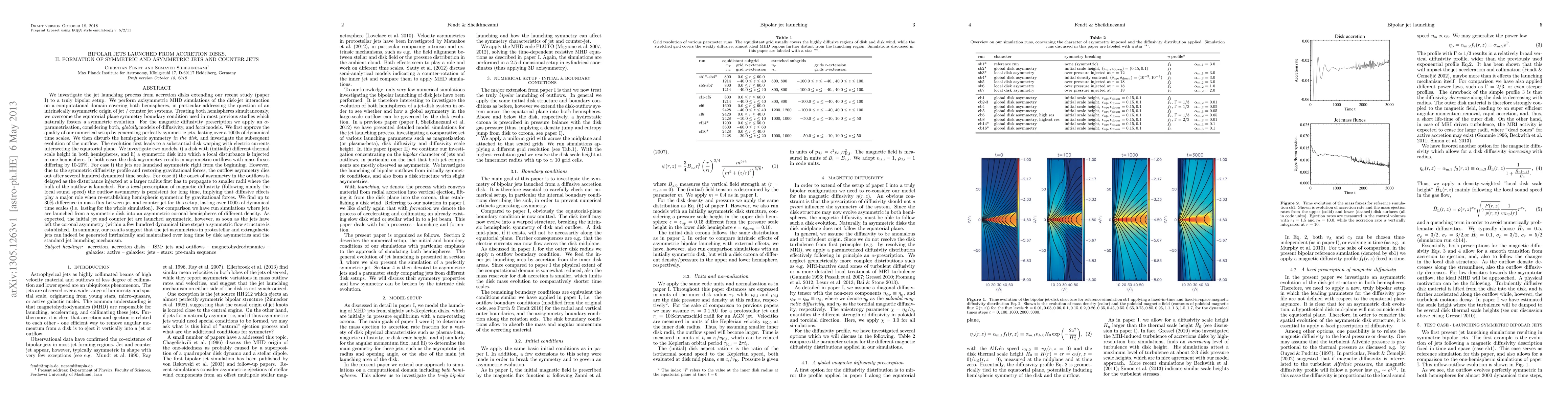 We investigate the jet launching process from accretion disks extending our recent study (paper I) to a truly bipolar setup. We perform axisymmetric MHD simulations of the disk-jet interaction on a computational domain covering both hemispheres, in particular addressing the question of an intrinsically asymmetric origin of jet / counter jet systems. Treating both hemispheres simultaneously, we overcome the equatorial plane symmetry boundary condition used in most previous studies which naturally fosters a symmetric evolution. For the magnetic diffusivity prescription we apply an alpha-parametrisation, considering both, globally models of diffusivity, and local models. We first approve the quality of our numerical setup by generating perfectly symmetric jets, lasting over a 1000s of dynamical time scales. We then disturb the hemispheric symmetry in the disk, and investigate the subsequent evolution of the outflow. The evolution first leads to a substantial disk warping with electric currents intersecting the equatorial plane. We investigate two models, i) a disk with (initially) different thermal scale height in both hemispheres, and ii) a symmetric disk into which a local disturbance is injected in one hemisphere. In both cases the disk asymmetry results in asymmetric outflows with mass fluxes differing by 10-20%. We find up to 30% difference in mass flux between jet and counter jet for this setup, lasting over 1000s of dynamical time scales (i.e. lasting for the whole simulation). In summary, our results suggest that the jet asymmetries in protostellar and extragalactic jets can indeed be generated intrinsically and maintained over long time by disk asymmetries and the standard jet launching mechanism.