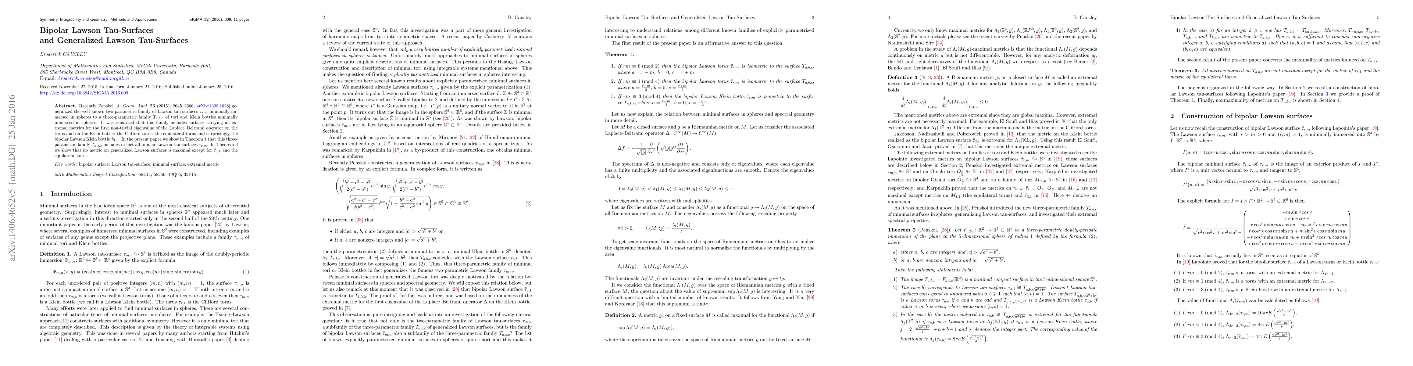 Recently Penskoi [J. Geom. Anal. 25 (2015), 2645-2666, arXiv:1308.1628] generalized the well known two-parametric family of Lawson tau-surfaces $\tau_{r,m}$ minimally immersed in spheres to a three-parametric family $T_{a,b,c}$ of tori and Klein bottles minimally immersed in spheres. It was remarked that this family includes surfaces carrying all extremal metrics for the first non-trivial eigenvalue of the Laplace-Beltrami operator on the torus and on the Klein bottle: the Clifford torus, the equilateral torus and surprisingly the bipolar Lawson Klein bottle $\tilde{\tau}_{3,1}$. In the present paper we show in Theorem 1 that this three-parametric family $T_{a,b,c}$ includes in fact all bipolar Lawson tau-surfaces $\tilde{\tau}_{r,m}$. In Theorem 3 we show that no metric on generalized Lawson surfaces is maximal except for $\tilde{\tau}_{3,1}$ and the equilateral torus.