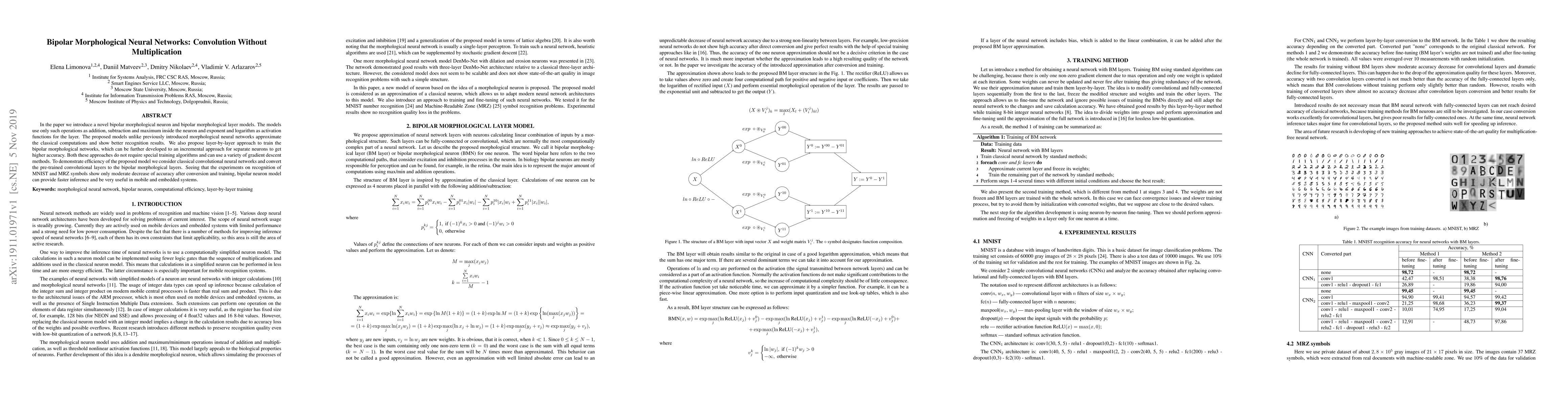 This paper introduces bipolar morphological neural networks that perform convolution without multiplication, using addition, subtraction, maximum operations, and exponent/logarithm activation functions. The proposed models achieve better recognition results and can be trained using standard gradient descent methods, demonstrating efficiency through conversion of pre-trained convolutional layers with minimal loss in accuracy.