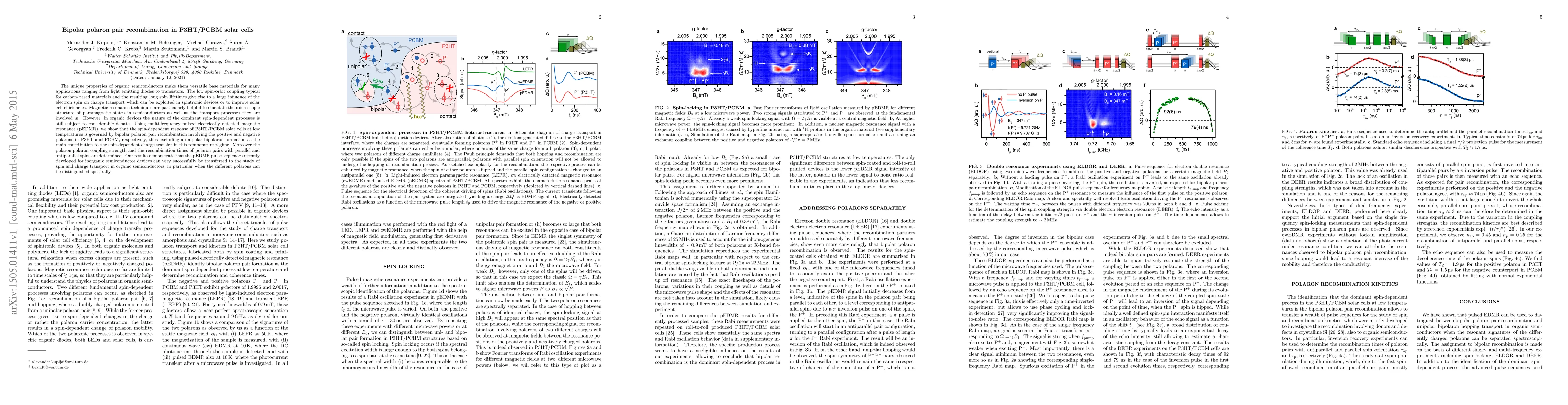 Researchers used a technique called pulsed electrically detected magnetic resonance to study spin-dependent charge transport in organic solar cells, finding that bipolar polaron pair recombination is the main process governing spin-dependent behavior at low temperatures.