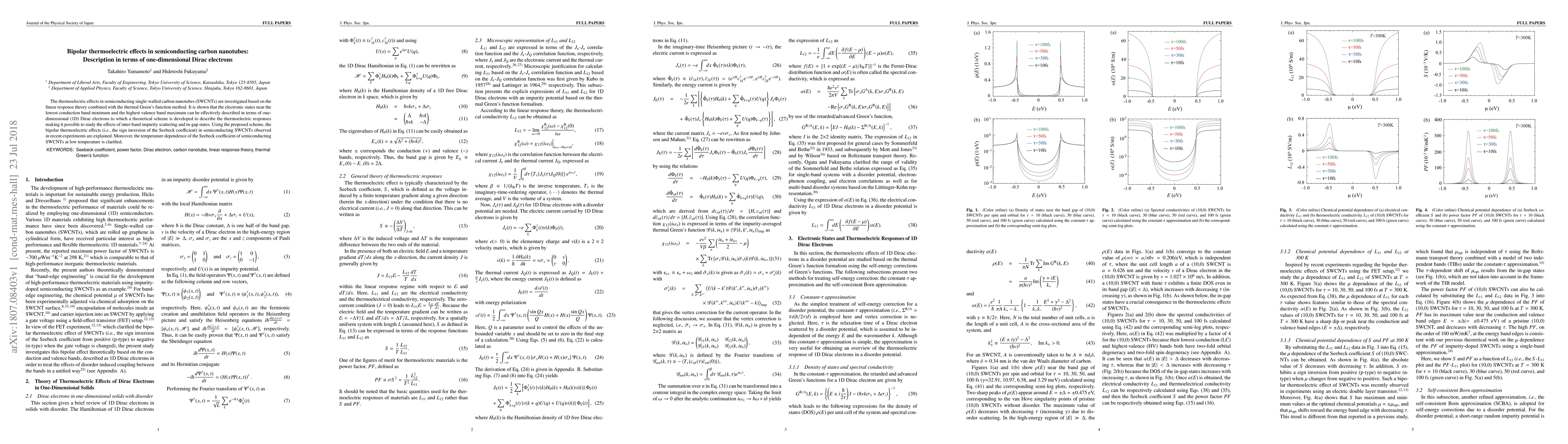 This paper develops a theoretical framework to describe thermoelectric effects in semiconducting single-walled carbon nanotubes (SWCNTs) using one-dimensional Dirac electrons, explaining the observed bipolar thermoelectric effects and clarifying the temperature dependence of the Seebeck coefficient. The study combines linear response theory with thermal Green's function methods to analyze inter-band impurity scattering and in-gap states.