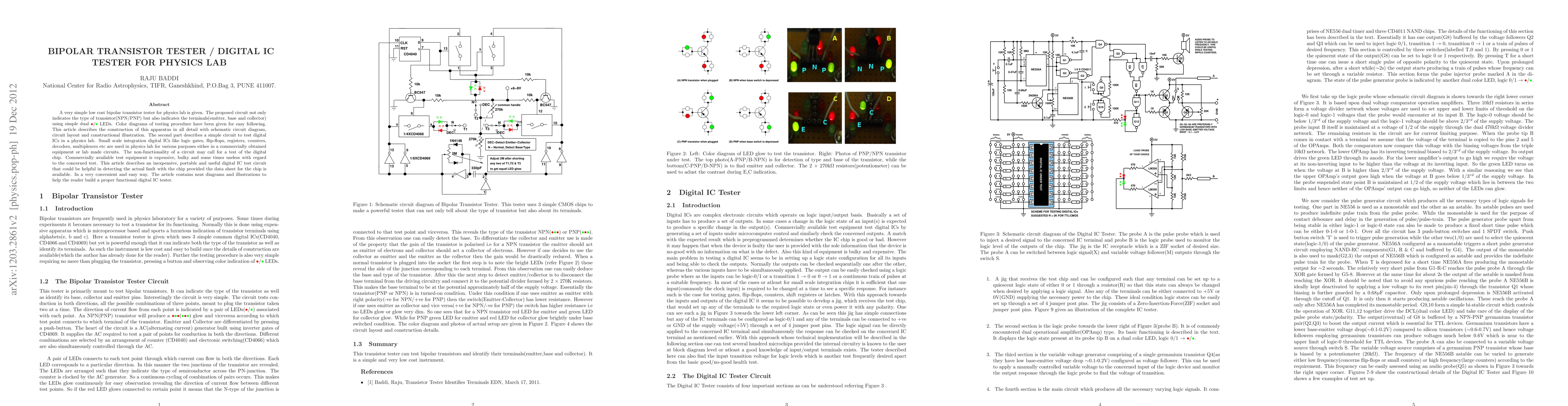 This paper presents a low-cost, simple bipolar transistor tester that identifies transistor types and terminals using dual-color LEDs, along with detailed construction instructions. It also describes a cost-effective, portable digital IC tester for small-scale integration chips, providing easy fault detection with accompanying diagrams.