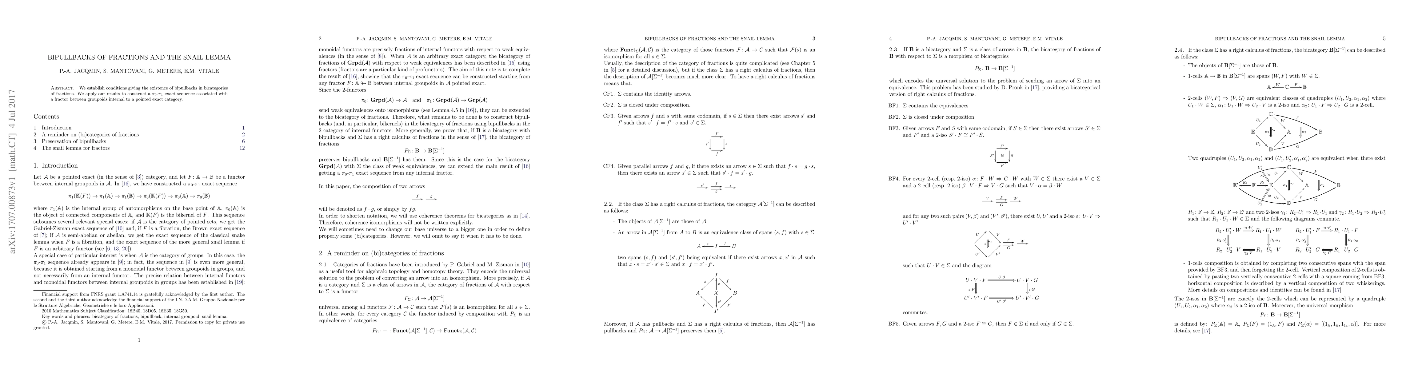 This paper establishes conditions for the existence of bipullbacks in bicategories of fractions and applies these results to construct a $\pi_0$-$\pi_1$ exact sequence linked to a fractor between groupoids in a pointed exact category, introducing the "snail lemma" in the process.